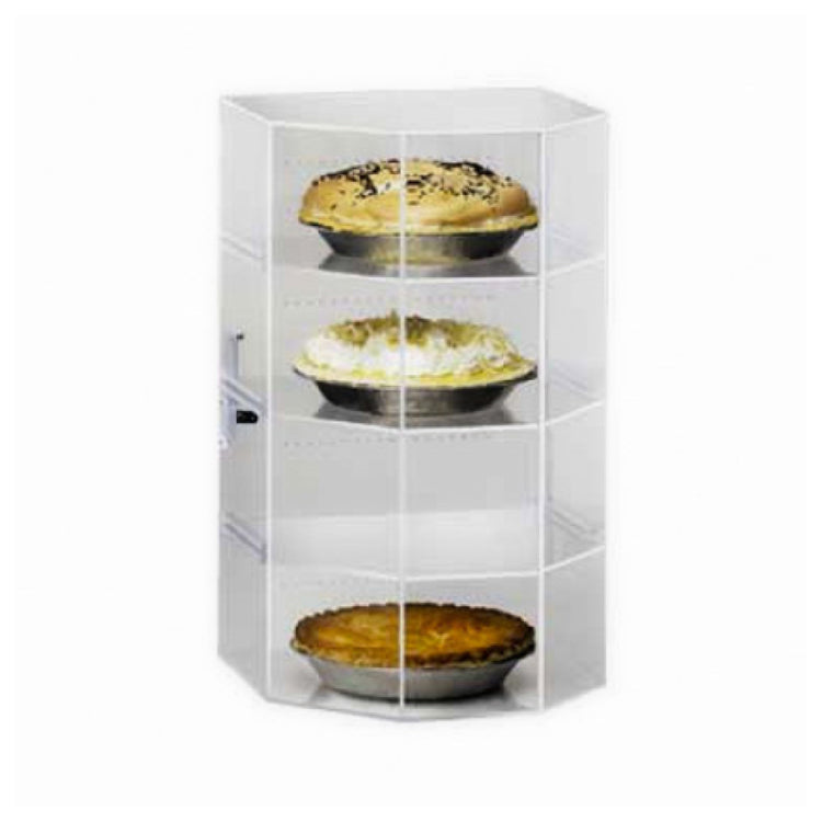 The Cal Mil 252 Classic Display Case is a meticulously designed non-refrigerated countertop unit, measuring 13"W x 12-1/2"D x 21-1/2"H, which efficiently combines functionality with aesthetic appeal. This display case is a 4-tier model featuring a unique hexagon front, allowing for an innovative and attractive presentation of products. The clear see-thru design, crafted from BPA-free acrylic, ensures maximum visibility from all angles, making it an ideal choice for businesses looking to showcase their items effectively. The unit includes four 12" x 12" intermediate shelves, providing ample space to organize and display a variety of products efficiently. The rear door offers easy accessibility for both stocking and customer interaction, enhancing the user experience. This display case is suitable for a range of industry segments, from bakeries to retail environments, where product visibility and accessibility are crucial. Its compact and elegant design allows it to fit seamlessly into any countertop setting, while its durable construction ensures long-lasting use. The Cal Mil 252 Classic Display Case is a versatile and practical solution for any business aiming to present their products in a modern and professional manner.