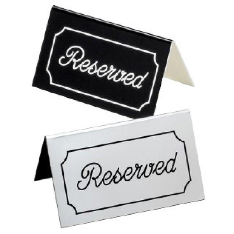 The Cal-Mil 273-10 "Reserved" Message Tent stands out as a practical and elegant solution for establishments looking to manage seating arrangements effectively. Measuring 5 inches in width and 3 inches in height, this message tent is compact yet highly visible, making it suitable for a variety of settings such as restaurants, event venues, and conference rooms. The dual-sided imprint ensures that the "Reserved" message is visible from multiple angles, enhancing its functionality in busy environments. Crafted with precision, the tent features an engraved, cursive font that adds a touch of sophistication, making it not only a functional tool but also an aesthetic accessory. The silver/black color scheme offers a classic and versatile look that complements any decor. Made from durable plastic, the Cal-Mil 273-10 is designed to withstand the demands of frequent use while maintaining its sleek appearance. This combination of durability, elegance, and practicality makes it an essential item for hospitality businesses and event organizers aiming to convey professionalism and organization. By providing clear communication with style, this message tent supports efficient seating management and enhances the overall customer experience.