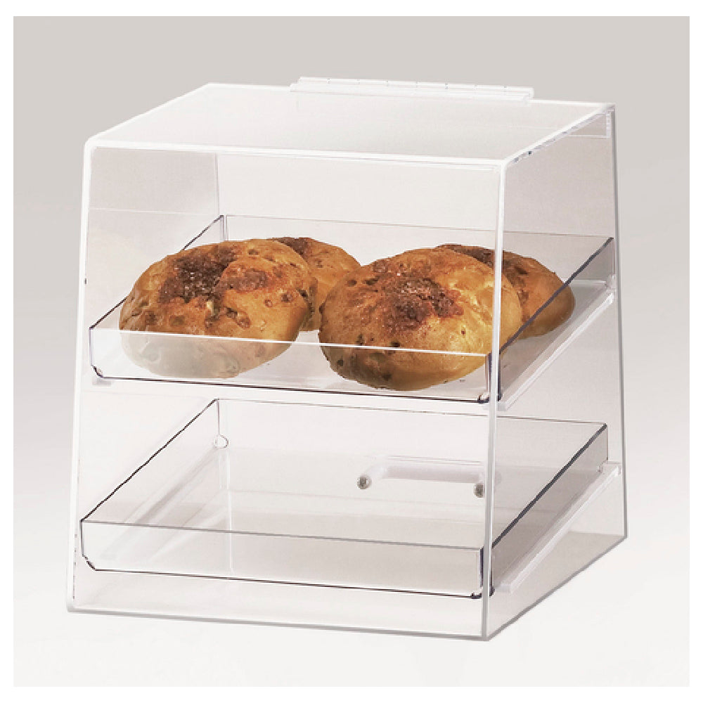 The Cal-Mil 280 Classic Display Case is a versatile 2-tier unit designed for countertop use, measuring 10 inches in width, 10 inches in depth, and 11 inches in height. Perfectly suited for various segments within the food service industry, this non-refrigerated display case is engineered with a slant front and a rear door, allowing for convenient access and presentation. Its clear acrylic construction ensures visibility while maintaining product safety as it is BPA Free. Featuring two drawers and two bins, the unit offers ample storage options, facilitating organized display and efficient service. Its see-thru design complements the attendant serve function, making it ideal for environments where customer interaction and product visibility are paramount. The inclusion of two 280-T trays further enhances its functionality, providing a neat and accessible display area. The Cal-Mil 280 Classic Display Case stands out for its thoughtful design, ensuring that products are showcased with clarity and ease, making it a valuable asset for bakeries, cafes, and other retail spaces that require a functional, stylish, and reliable countertop solution.