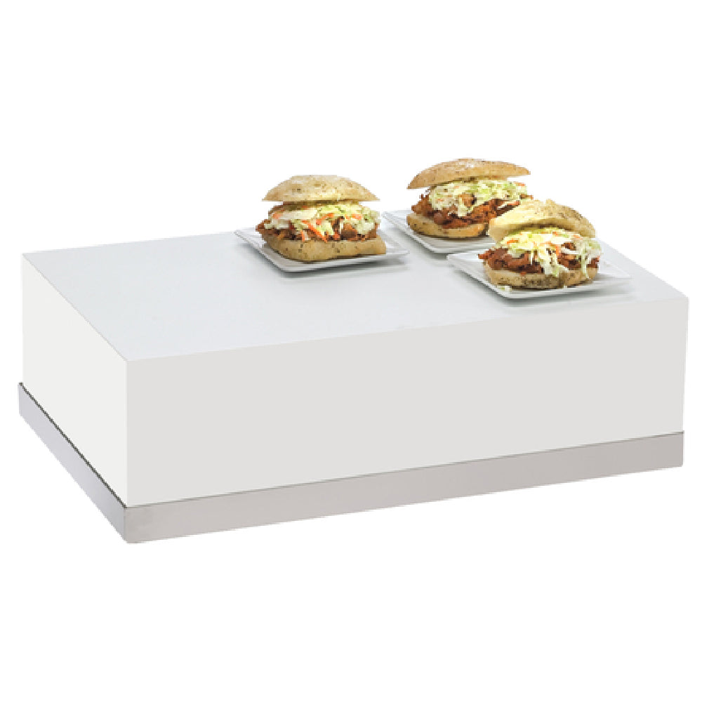 The Cal Mil 3025-55 Luxe Display Riser is a sophisticated piece designed to enhance the presentation of various display items in commercial settings. Measuring 12 inches wide, 20 inches deep, and 6-1/2 inches in height, this rectangular riser provides ample space to elevate products, effectively making them the focal point of any display arrangement. Constructed with a sleek white metal body, it seamlessly integrates into modern decor themes while providing durability and stability. The riser's design is further accentuated by a stainless steel accent base, adding a touch of elegance and ensuring a robust platform for various display needs. This versatile riser is particularly beneficial for segments such as food service, retail, and event planning, where presentation quality directly impacts customer engagement and satisfaction. The Cal Mil 3025-55 Luxe Display Riser caters to professionals seeking to enhance visual appeal with a reliable and aesthetically pleasing product, making it a valuable addition to any display toolkit.