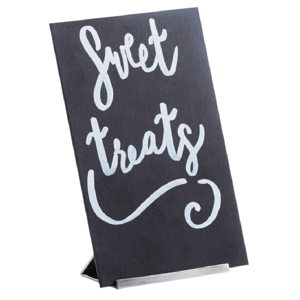 The Cal Mil 3049-46 Chalkboard Rectangular 4" X 6" Writing Surface is an innovative tool designed for both functional and decorative use in various settings. This chalkboard features a compact rectangular writing surface measuring 4 inches by 6 inches, making it an ideal choice for intimate displays and personalized messages. Its open frame design is complemented by a sleek stainless steel base, adding a touch of modern elegance to its black wood construction. The high-quality materials ensure durability and stability, allowing it to withstand frequent use in busy environments. Furthermore, the product is BPA free, assuring users of its safety for use in food-related establishments or areas where health standards are a priority. The Cal Mil 3049-46 Chalkboard is particularly suited for hospitality venues, retail spaces, or even personal home use, providing a versatile solution for displaying information or enhancing décor. Its compact size and stylish design make it a standout feature in any setting, while the use of robust materials underscores its reliability and longevity. This chalkboard seamlessly combines functionality with aesthetic appeal, making it a valuable addition to any professional or personal space looking for an efficient signage solution.
