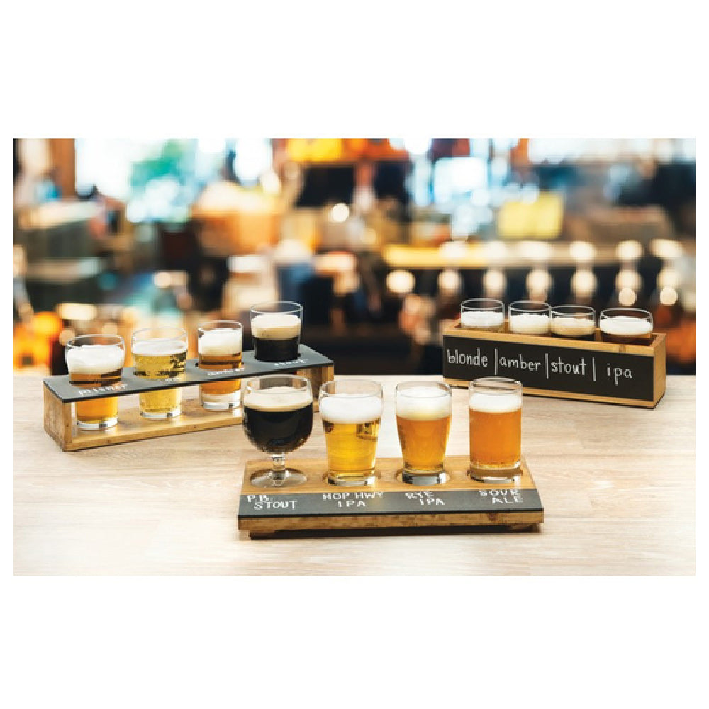 The Cal Mil 3058 Tasting Crate is a meticulously crafted display solution measuring 10-1/4 inches in width, 3-1/4 inches in depth, and 2-3/4 inches in height, offering a compact yet functional design tailored for various tasting events. This tasting crate features a black write-on surface, enhancing its versatility by allowing users to personalize or label the display area with a chalkboard pen, making it ideal for dynamic environments such as restaurants, bars, or tasting events. Constructed from wood, this crate provides a durable and aesthetically pleasing presentation platform. It includes four 2-1/4 inch cutouts, specifically designed to securely hold tasters, which makes it suitable for showcasing an array of beverages or samples. However, it is important to note that glasses are not included with this crate. The practical design and thoughtful dimensions of the Cal Mil 3058 Tasting Crate make it a favored choice across diverse market segments, including hospitality and event planning industries, where there is a need for stylish, customizable, and efficient presentation solutions. Its integration of functionality and elegance helps it stand out as a preferred option for professionals seeking a unique and practical display method.