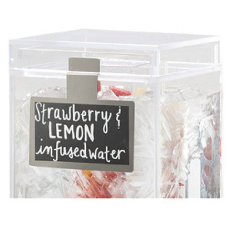 The Cal Mil 3059 Beverage Sign is a purposefully crafted accessory, measuring 5 inches in width and 3 inches in depth, tailored to enhance the functionality and aesthetic of beverage dispensing areas. This sign features a black write-on surface, specifically designed for use with a chalkboard pen, providing a versatile medium for clear and customizable labeling. Its compatibility extends to all square beverage dispensers, making it an adaptable addition to various service environments. The integration of stainless steel within its construction not only contributes to its durability but also aligns with contemporary design sensibilities, ensuring it complements a wide range of beverage service setups. The Cal Mil 3059 Beverage Sign is particularly valued in hospitality settings, catering events, and food service industries where clarity of presentation and adaptability are paramount. The sign's dimensions and materials have been meticulously selected to offer a practical solution that maintains a sleek and professional appearance, enhancing the overall experience for both service providers and patrons alike. This product stands out in its ability to merge functionality with style, addressing the essential needs of effective communication in beverage service display contexts.