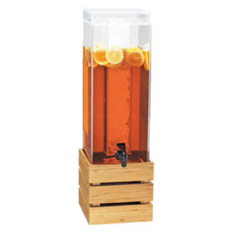 The Cal Mil 3301-3-60 Beverage Dispenser stands out with its 3-gallon capacity, making it a practical choice for both small and large beverage service scenarios. Its dimensions of 8"W x 8"D x 25-1/2"H make it a compact yet substantial addition to any beverage station. This single, square dispenser features an ice chamber, ensuring drinks remain chilled and refreshing for extended periods. The clear acrylic body not only provides a modern aesthetic but also allows for easy monitoring of beverage levels. Complementing the dispenser is a bamboo crate stand, which adds an eco-friendly and stylish element to its overall design. The inclusion of a secure lid and user-friendly spigot enhances its utility, making it easy to serve a variety of beverages. Notably, the Cal Mil 3301-3-60 is BPA-free, addressing health and safety concerns for consumers. Its thoughtful construction meets the demands of various market segments, from catering services and hospitality to office environments and casual gatherings, providing a reliable and aesthetically pleasing beverage dispensing solution.