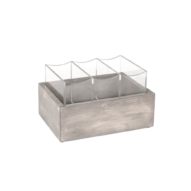 The Cal-Mil 3408-110 Aspen Flatware Holder is a meticulously crafted organization tool designed for various food service environments. Measuring 6 inches by 9 inches with a height of 5-1/4 inches, this flatware holder is engineered to fit seamlessly into any countertop or serving station setup. It features three distinct sections, providing ample space for sorting and storing cutlery efficiently. Constructed from gray-washed pine wood, it offers a rustic yet contemporary aesthetic that complements a wide range of decor styles. The inclusion of clear acrylic dividers adds a modern touch while allowing for quick visual inventory of flatware levels. This thoughtfully designed flatware holder not only enhances the organization in busy kitchens and dining areas but also serves as an elegant display piece in buffet and catering setups. Its durable construction and versatile design make it suitable for restaurants, cafes, and catering services seeking to optimize functionality and aesthetics in their service operations.