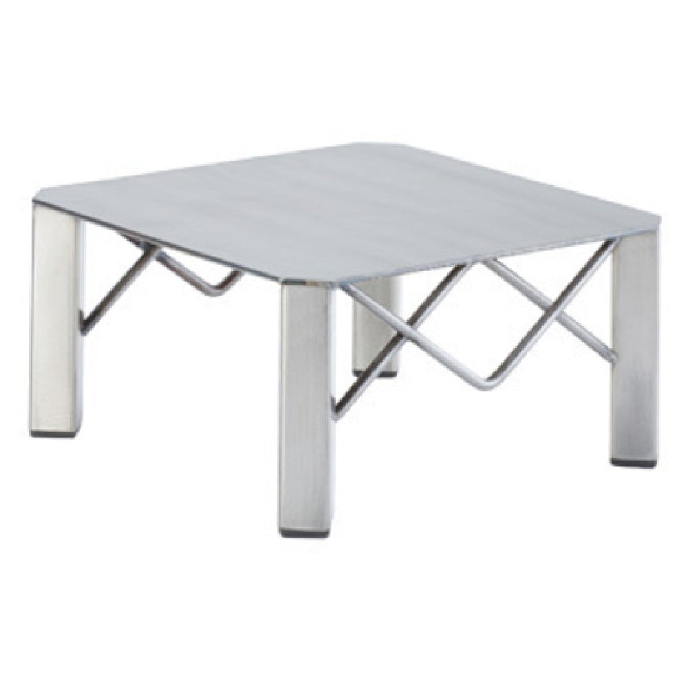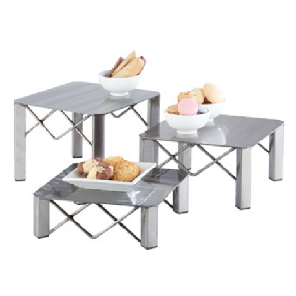 The Cal Mil 3417-5 Industrial Risers 10"W x 10"D x 5"H Square is an essential piece for food service displays, blending functionality with a sleek, industrial aesthetic. Crafted from metal and featuring a polished finish, these risers are designed to elevate culinary presentations, adding a layer of sophistication to any setting. The square shape ensures stability, while the dimensions of 10 inches by 10 inches by 5 inches offer a compact yet impactful presence, perfect for highlighting smaller items or creating tiered arrangements. Equipped with sturdy legs, this riser gains an additional layer of balance and support, making it suitable for a variety of environments, from upscale buffets to casual dining setups. The industrial style seamlessly fits into modern decor, appealing to segments ranging from catering companies to restaurant chains aiming to enhance visual appeal. Specifically engineered for durability, the Cal Mil 3417-5 risers are ideal for repeated use in high-traffic areas, providing a reliable solution for dynamic food presentation needs. This product serves not only as a functional display piece but also as an aesthetic enhancer, making it a valuable asset for businesses aiming to create captivating and organized dining experiences.
