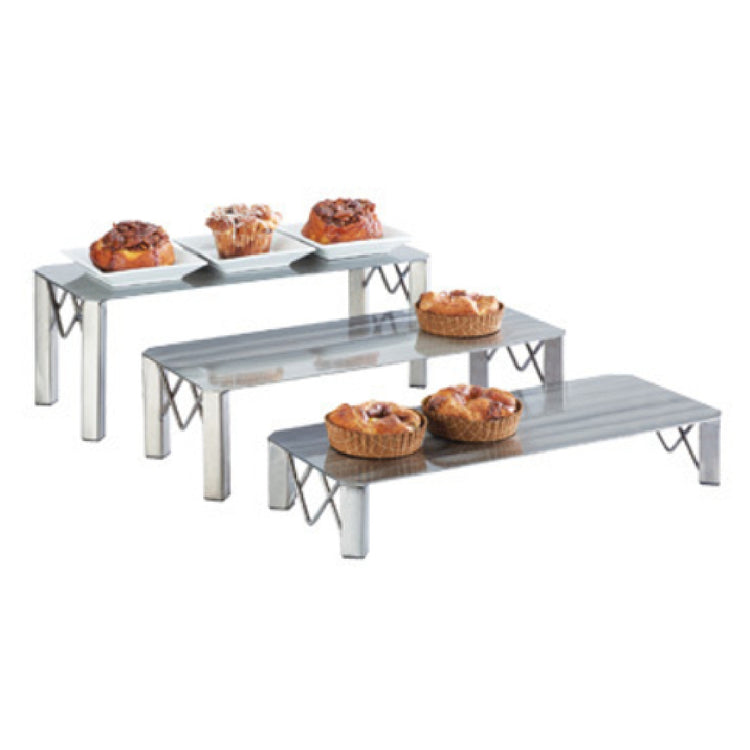 The Cal Mil 3418-5 Industrial Riser is a rectangular piece measured at 20" in width, 8" in depth, and 5" in height, designed for a variety of professional display setups. Crafted with sturdy metal construction, this industrial riser features a polished finish that enhances its aesthetic appeal, making it suitable for both modern and classic environments. The inclusion of legs provides stability and elevation, allowing items to be showcased effectively. This riser's dimensions and design make it versatile, catering to different segment markets such as retail displays, event setups, and culinary presentations where showcasing products or dishes at varying heights is essential. Its robust build ensures durability, while the polished finish adds a touch of elegance to its industrial look. The Cal Mil 3418-5 Industrial Riser is an excellent choice for industries looking for reliable and visually appealing display solutions, emphasizing both functionality and style in its design. This product is particularly beneficial for businesses aiming to create dynamic and engaging presentations, with its size and structure supporting a wide range of display needs. Its polished metal finish also offers an easy-to-maintain surface, ensuring long-lasting use.