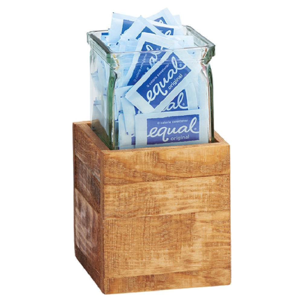 The Cal Mil 3427-5-99 Madera Single Jar Riser is a precisely crafted display piece measuring 4-1/2"W x 4-1/2"D x 5"H, specifically designed to enhance the presentation of various items. This square riser features the natural and rustic elegance of pine, providing a warm and inviting aesthetic suitable for both modern and traditional settings. Its construction is centered around a glass jar, offering a clear and unobstructed view of its contents, making it perfect for showcasing small food items, decorative objects, or retail products. This versatile riser caters to diverse market segments, including the hospitality industry, retail spaces, and home decor enthusiasts, who value both functionality and style. The rustic pine adds a unique touch that blends seamlessly with various interior designs, making it an ideal choice for establishments looking to create an inviting and cozy atmosphere. Whether used in a restaurant buffet, a store display, or as a decorative piece at home, the Cal Mil 3427-5-99 Madera Single Jar Riser combines practicality with an appealing design, ensuring that it stands out as a valuable and attractive feature in any setting.