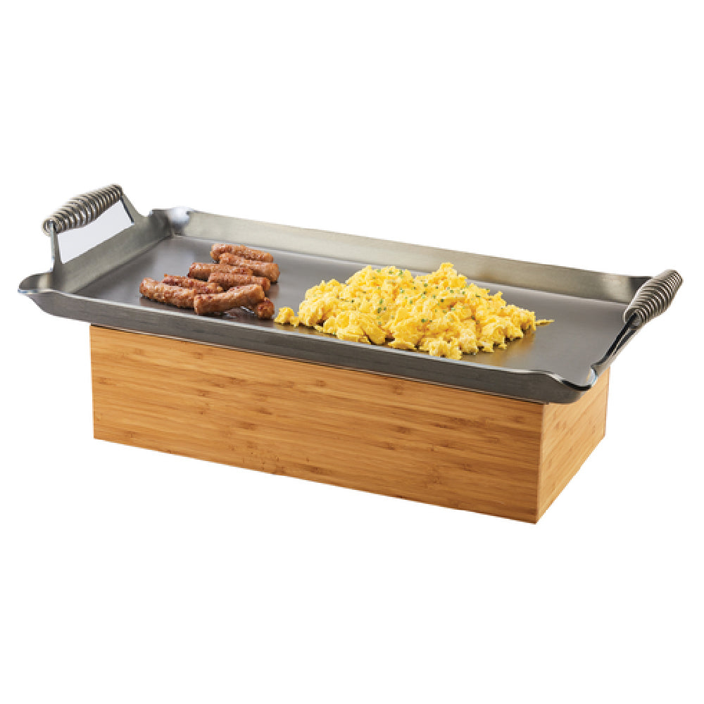 The Cal Mil 3439-60 Chafer Alternative is a versatile and stylish solution for food service professionals looking to enhance their buffet or catering displays. This rectangular chafer alternative measures 19-1/2 inches wide, 9-3/4 inches deep, and 5-1/2 inches high, making it a compact choice that fits seamlessly into various serving arrangements. Constructed with a wire grill and designed for use with canned heat, this chafer alternative ensures even heating and efficient fuel usage, making it suitable for both large-scale events and intimate gatherings. The inclusion of bamboo elements adds an eco-friendly touch, appealing to environmentally conscious consumers. The Cal Mil 3439-60 is ideal for caterers, hotels, and restaurants seeking a modern and sustainable option that maintains the functionality of traditional chafing dishes without the use of open flames or electricity. Its unique design not only offers a safe and practical heating solution but also enhances the presentation of culinary creations. This product caters to diverse market segments by combining style, efficiency, and sustainability, making it a valuable asset for any food service operation aiming to impress guests while prioritizing safety and environmental impact.
