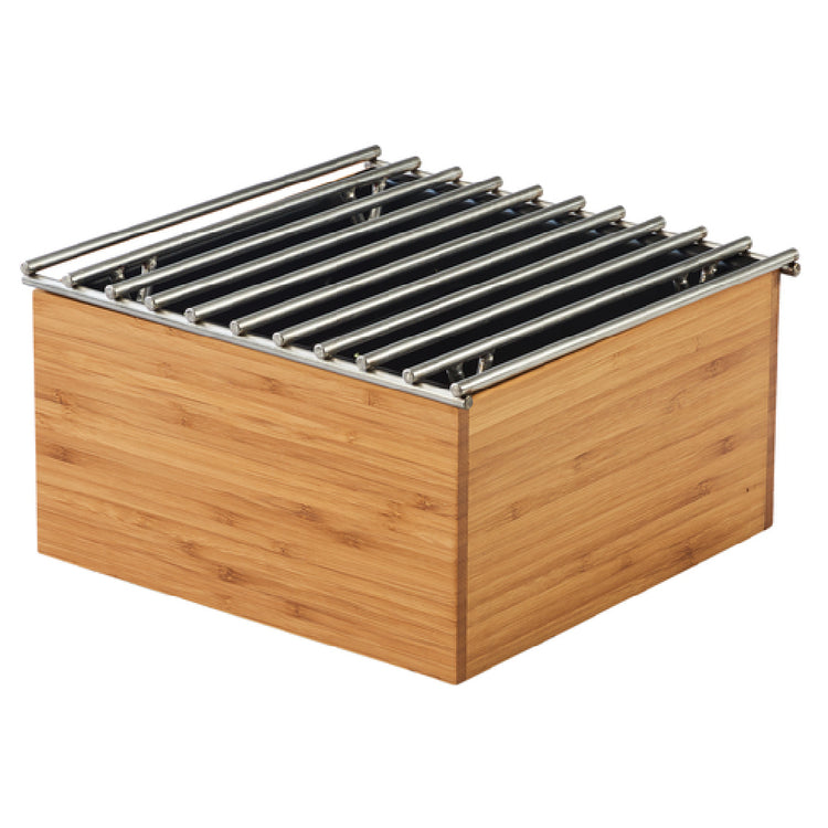 The Cal Mil 3440-60 Chafer Alternative is a distinctive square serving solution measuring 9-3/4"W x 9-3/4"D x 5-1/2"H, designed to cater to various market segments within the hospitality and catering industry. This innovative product combines functionality and aesthetic appeal with its sleek wire grill, proving to be an excellent choice for those seeking an alternative to traditional chafing dishes. It is crafted from sustainable bamboo, reflecting an eco-friendly approach that aligns with modern environmental standards. The unit is specifically engineered for use with canned heat, making it a reliable option for maintaining optimal food temperatures during service. Its compact dimensions make it suitable for intimate settings, such as boutique hotels, intimate gatherings, and upscale events where space is at a premium. The Cal Mil 3440-60 Chafer Alternative's modern design and versatile application make it a valuable asset for catering businesses aiming to provide a unique dining experience. Its thoughtful construction and practical features cater to the needs of professionals looking to balance sustainability with functionality, ensuring that it stands out as a preferred choice in the catering equipment market.