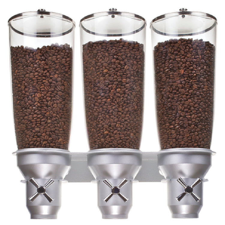 The Cal Mil 3518-3-39 Cereal Dispenser is meticulously designed with three 5L capacity cylinders, making it an efficient and stylish solution for cereal storage and dispensing. Measuring at 18-1/2"W x 6-3/4"D x 19-3/4"H, this dispenser is compact yet spacious enough to accommodate various cereal types, enhancing its application in both residential and commercial settings. The 6-wing turn & serve mechanism offers a convenient and controlled dispensing experience, minimizing waste and ensuring easy access. Notably wall-mountable, this dispenser optimizes counter space, making it ideal for environments with limited room. The dispenser is presented in an elegant platinum finish, providing a modern aesthetic that complements any setting. Although the hardware is not included, the flexibility in installation and use makes this cereal dispenser a versatile choice for different market segments, from cafes and breakfast buffets to office pantries and home kitchens, where style, functionality, and space efficiency are paramount.