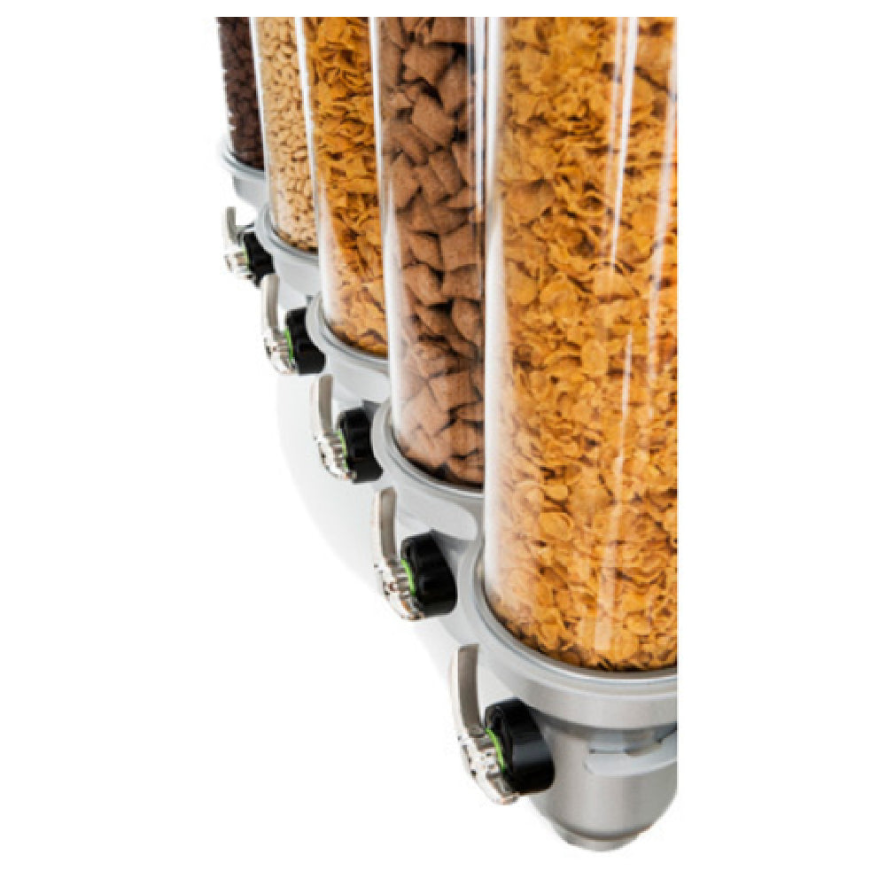 The Cal Mil 3520-5-39 Cereal Dispenser is a versatile and efficient solution for serving and storing cereals, designed to meet the needs of various market segments in the food service industry. With five individual dispensers, each offering a 4.5L capacity, this unit provides ample space for a variety of cereals or other dry goods. The dimensions of 27-1/2"W x 6-1/2"D x 21-3/4"H make it a compact yet substantial presence, fitting seamlessly into different environments. This model is wall-mountable, allowing for customizable placement to maximize space efficiency in busy kitchens or dining areas. Featuring a 6-wing turn and serve mechanism, it ensures precise portion control while maintaining the freshness of the contents. Please note that the hardware for wall mounting is not included, allowing users to select components that best suit their specific installation requirements. The Cal Mil 3520-5-39 Cereal Dispenser is ideal for establishments such as hotels, cafeterias, and buffet-style restaurants, offering a reliable and practical way to present cereals, which enhances customer experience through convenience and style.