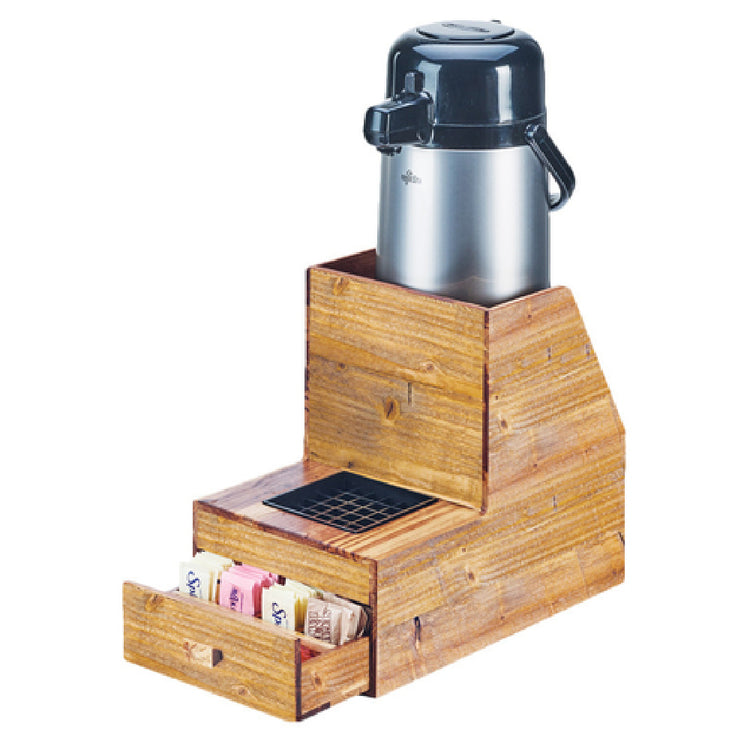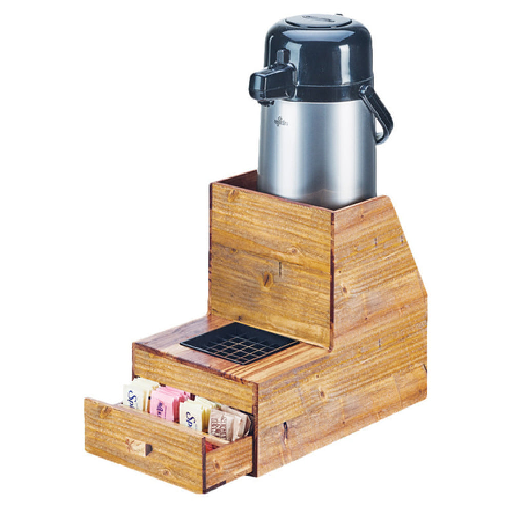 The Cal Mil 3623-99 Madera Airpot Stand is a versatile and practical solution for beverage service, measuring 8"W x 13"D x 11-1/4"H. This single-unit stand is designed to accommodate airpots, making it an essential addition to coffee service setups in cafes, offices, and hospitality venues. Constructed from rustic pine, it offers a charming, natural aesthetic that complements a variety of interior styles. The stand includes a packet drawer, providing convenient storage for coffee accessories such as sugar packets, stirrers, and creamers, thereby enhancing the efficiency of service operations. A removable drip tray is integrated into the design, simplifying cleaning and maintenance by capturing any spills or drips during use. The thoughtful combination of features in the Cal Mil 3623-99 Madera Airpot Stand makes it a valuable asset for businesses aiming to streamline their beverage service while maintaining a rustic and welcoming presentation. Its compact dimensions make it suitable for environments where space is a premium, while its functional design supports high-frequency use, catering effectively to the needs of different market segments within the food and beverage industry.