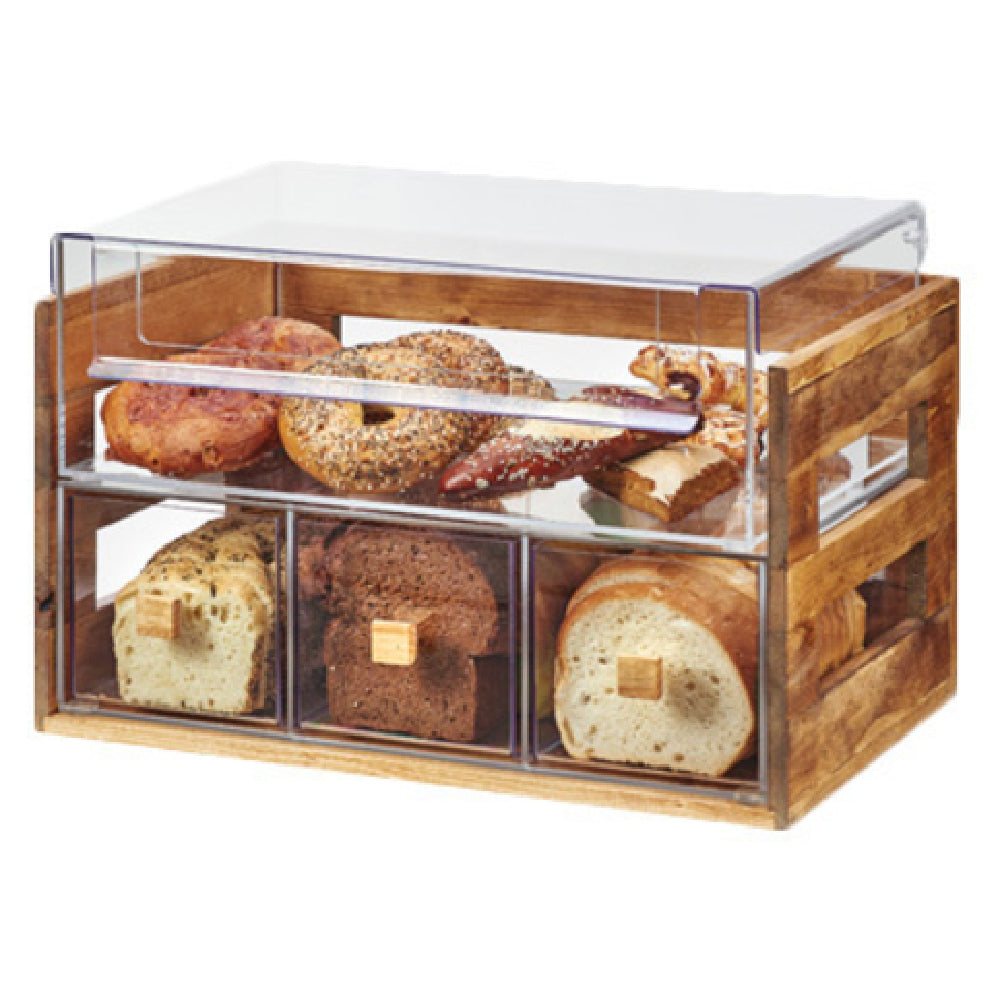 The Cal Mil 3624-99 Madera Bread Display Case is a versatile display solution, measuring 20-1/4" in width, 12-3/4" in depth, and 13-1/4" in height, designed to enhance the presentation of baked goods across various market segments, including bakeries, cafes, and hotels. This 2-tier display case is crafted from an acrylic body, providing clear visibility and a modern aesthetic, while the rustic pine finish adds a touch of warmth and elegance to its appearance. It features three drawers with knobs and one bin with handles, offering practical and accessible storage for different types of bread and pastries, making it suitable for self-service or attended stations. The inclusion of side cutouts further facilitates easy access and replenishment, ensuring a seamless customer experience. This thoughtfully designed bread display case not only maximizes space efficiency but also emphasizes durability and style, making it an ideal choice for establishments looking to maintain a sophisticated yet functional display environment. Its compact dimensions and efficient design enable it to fit effortlessly into various counter spaces, making it a valuable addition to any food service operation aiming to elevate its presentation standards.