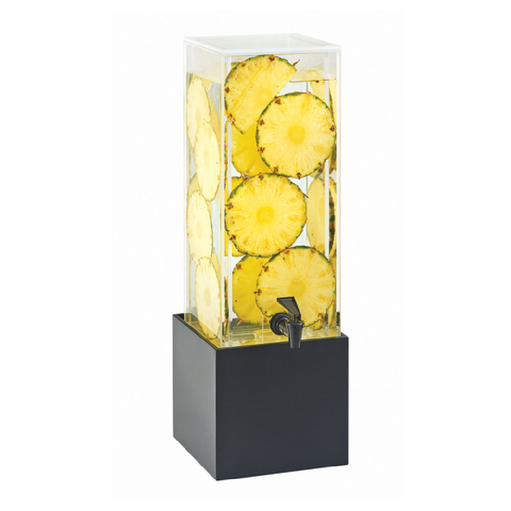 The Cal-Mil 3697-3-96 Midnight Bamboo Beverage Dispenser is a uniquely crafted solution for beverage service, offering a substantial 3-gallon capacity to accommodate a variety of drinks. Its precise dimensions of 8-1/4"W x 9-3/4"D x 25-3/4"H make it a compact yet striking addition to any setting. The square design is enhanced by decorative infusion walls, which not only add aesthetic appeal but also facilitate the infusion of flavors into beverages, elevating the drink experience for guests. The inclusion of a drip tray base ensures cleanliness and efficiency during use, capturing any spills to maintain a tidy service area. Additionally, the dispenser is BPA free, making it a safe choice for serving beverages without the risk of harmful chemical exposure. This product is particularly suitable for upscale dining environments, catering events, and hospitality venues where style and substance are equally valued. The Midnight Bamboo finish adds a touch of sophistication and blends seamlessly with various décor styles, making it an ideal choice for those looking to enhance their beverage presentation while maintaining a commitment to safety and quality.