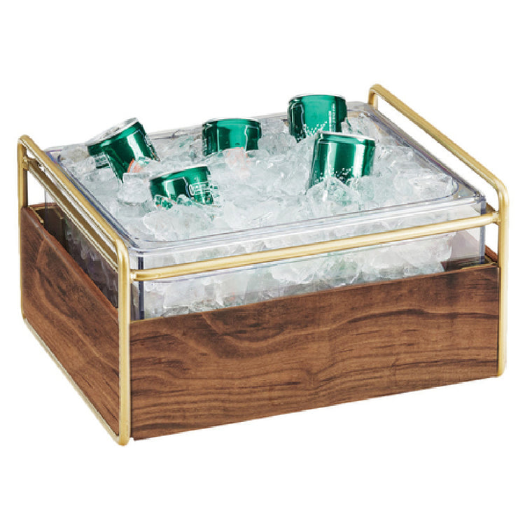 The Cal Mil 3702-10-46 Mid-Century Ice Housing is a sophisticated and functional addition to any professional catering or hospitality setting. Measuring 11-1/4 inches in width, 13-3/4 inches in depth, and 7-1/4 inches in height, this rectangular ice housing offers a compact yet substantial space for maintaining ice cool with efficiency and style. Constructed with a clear polycarbonate pan, it provides durability and visibility, ensuring the ice remains uncontaminated while allowing for easy monitoring of its contents. The design is accentuated with a wood frame and brass finishes, evoking a mid-century aesthetic that enhances the visual appeal of any venue. This product is particularly suited for upscale events, hotel buffets, or bars, where both functionality and design are paramount. The combination of materials not only ensures longevity but also complements a variety of decor styles, from vintage to contemporary. The Cal Mil 3702-10-46 stands out as a versatile and aesthetically pleasing solution for professionals who value both form and function in their service equipment, meeting the diverse needs across different market segments within the service industry.