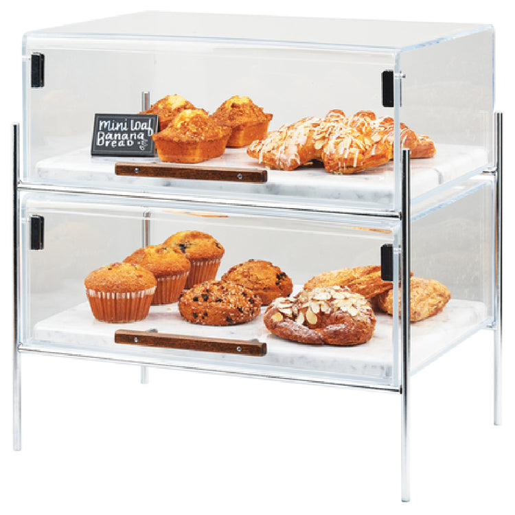 The Cal-Mil 3706-1511-49 Mid-Century Pastry Display Case is a meticulously crafted piece, ideal for showcasing pastries in a stylish and accessible manner. Measuring 16-1/4"W x 11-1/4"D x 18"H, this unit features a compact yet functional design that caters to various market segments, from small cafes to upscale bakeries. Its 2-tier configuration allows for efficient presentation and organization of baked goods. The self-serve design, complemented by two doors equipped with wooden handles, ensures ease of use for both customers and staff. The case includes two 15" x 11" faux marble melamine inserts, providing an elegant backdrop while being practical for food service environments. The clear plastic construction ensures maximum visibility of your products, enticing customers with unobstructed views. A chrome frame adds a touch of modern sophistication, enhancing its aesthetic appeal while ensuring durability. Whether in a bustling bakery or a cozy café, the Cal-Mil 3706-1511-49 seamlessly blends functionality with mid-century design, making it a versatile and valuable display solution in the pastry industry.