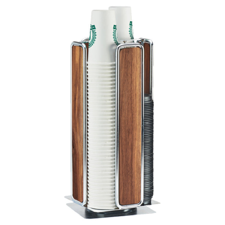 The Cal Mil 3709-49 Mid-Century Cup/Lid Organizer is a compact and efficient solution for organizing beverage accessories in various commercial settings. Measuring 8-1/4" wide, 8-1/4" deep, and 18" high, this revolving organizer is designed to maximize space while providing easy access to cups and lids. It features four distinct sections, each capable of accommodating cups and lids up to a diameter of 3-3/4". This makes it versatile enough for cafes, corporate break rooms, or convenience stores that require a tidy and accessible setup. The organizer’s aesthetic appeal is enhanced by its wood accents, which add a touch of mid-century elegance, while the chrome construction ensures durability and resistance to wear. Its revolving design facilitates quick access from all angles, improving efficiency in high-traffic areas. The Cal Mil 3709-49 Mid-Century Cup/Lid Organizer is a practical choice for businesses seeking a stylish and functional solution for their beverage organizing needs, combining visual appeal with practical utility for enhanced organizational efficiency in any setting.