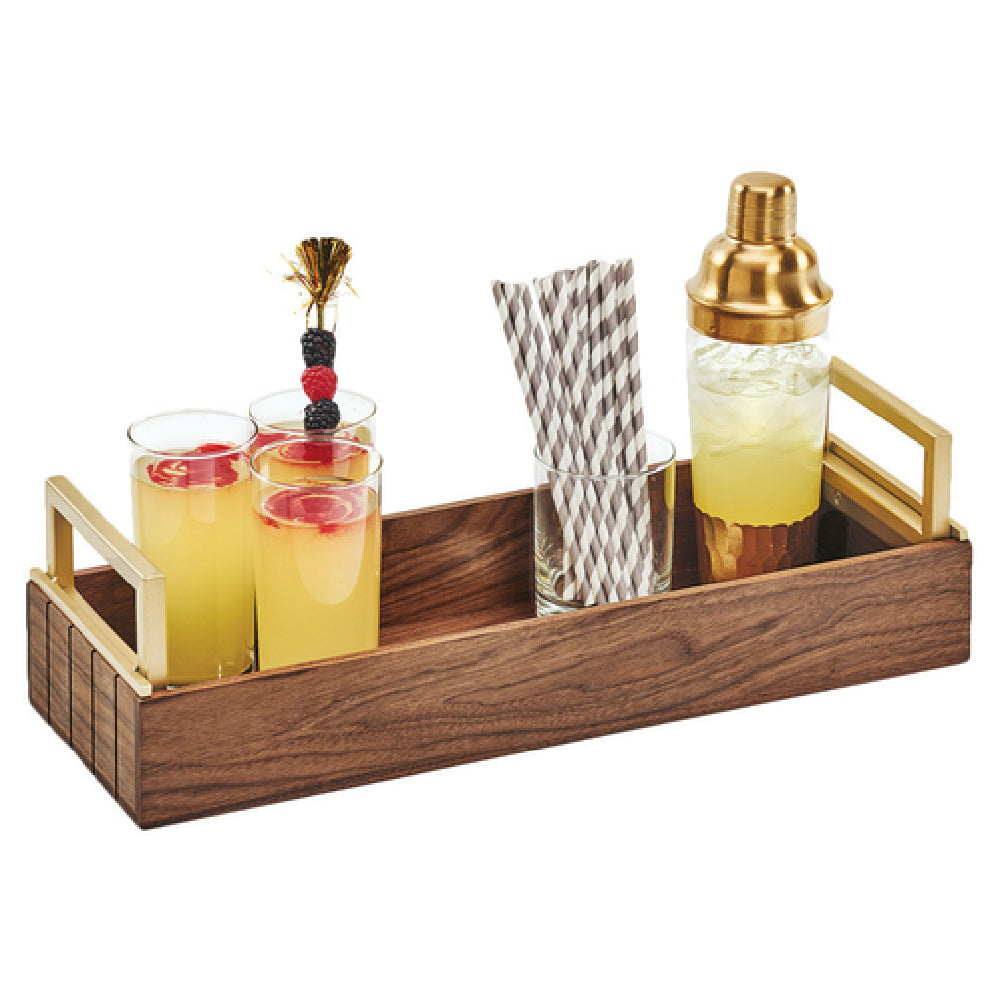 The Cal-Mil 3724-49 Mid-Century Reversible Riser is a versatile addition to any dining or display setting, showcasing its sleek walnut finish complemented by a stylish chrome frame. Measuring 20 inches in width, 7 inches in depth, and 6 inches in height, this innovative product offers a dual-purpose design that enhances its functionality. Its reversible feature allows it to be easily flipped and utilized as a basket, providing flexibility for various presentation needs. This adaptability makes the Cal-Mil 3724-49 a valuable asset across multiple market segments, including the hospitality industry, event planning, and retail display environments. The mid-century aesthetic not only adds a touch of elegance but also ensures the product aligns with both modern and retro-themed decors. Whether used as a riser to elevate dishes for a buffet display or transformed into a basket to hold items, its robust construction promises durability and aesthetic appeal. This riser's thoughtful design caters to professionals seeking both form and function in their service and display solutions, making it a must-have for those aiming to enhance their presentation with a touch of mid-century charm.