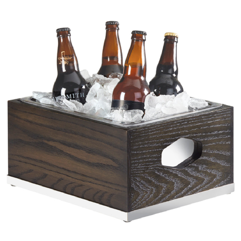 The Cal Mil 3800-10-87 Cinderwood Ice Housing is a versatile and stylish choice for commercial settings, blending form and function seamlessly. This rectangular ice housing measures 13-1/4 inches in width, 11 inches in depth, and 7-1/4 inches in height, providing ample space for ice display and storage. The unit includes a clear polycarbonate pan, which ensures durability and easy visibility of contents, and a condensation liner to prevent moisture buildup, maintaining a pristine presentation. The design features geometric end cutouts that add a modern aesthetic, while the mirrored base and trim enhance its visual appeal, making it suitable for upscale environments. Constructed from oak wood in a dark ash gray finish, the Cinderwood Ice Housing exudes elegance and sophistication. It is BPA-free, assuring users of its safety in food service applications. This product is ideal for catering events, buffets, and restaurant settings, where both functionality and presentation are paramount. Its unique blend of materials and thoughtful design resonates with an eco-conscious and style-savvy audience, making it a valuable asset in diverse market segments that prioritize aesthetics alongside performance.