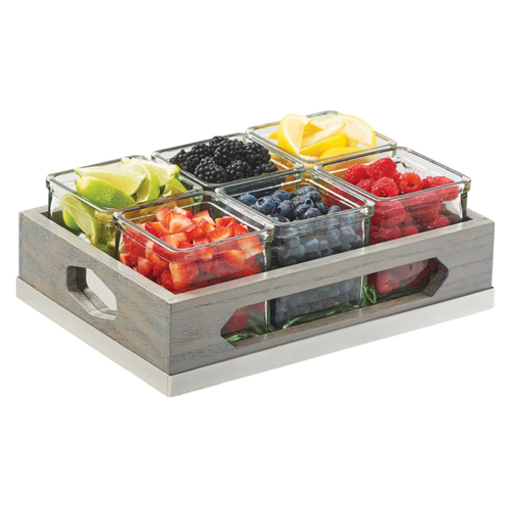 The Cal Mil 3805-83 Ashwood Jar Display is a meticulously designed showcase solution, measuring 12-3/4"W x 9"D x 4-1/2"H, that integrates elegance with practicality for various industry applications. This display features six glass jars, each measuring 4"W x 4"D x 4"H, making it a versatile choice for presenting a variety of items, from condiments and toppings in food service settings to craft supplies or retail products in other sectors. The rectangular design is accentuated by a sophisticated mirrored base trim that enhances visibility and adds a touch of class to any presentation. Crafted from durable oak wood with a gray wash finish, this display combines rustic charm with modern aesthetics, ensuring it complements diverse interior styles. Its compact yet functional design allows for efficient use of counter or shelf space, making it suitable for markets where presentation and space optimization are crucial. The Cal Mil 3805-83 Ashwood Jar Display is ideal for food service providers, retail environments, and hospitality venues looking to enhance their product presentation with a stylish, yet practical, display unit.