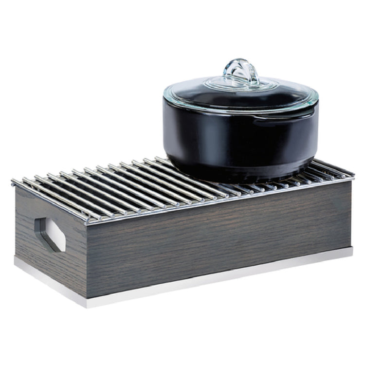 The Cal Mil 3813-83 Ashwood Chafer Alternative is a meticulously crafted rectangular warming solution, measuring 19-1/2 inches wide, 10 inches deep, and 5-1/2 inches high. This innovative product is a distinctive choice for various segments within the hospitality industry, including luxury catering services and high-end buffet presentations. Its design features a wire grill and windguard that ensure efficient heat distribution and protection from environmental factors, enhancing food presentation and quality. The geometric end cutouts contribute to its modern aesthetic, while the mirrored base trim adds a touch of elegance. Manufactured from oak wood with a sophisticated gray wash finish, the chafer alternative seamlessly blends traditional materials with contemporary design elements, making it an attractive centerpiece. This product stands out in the market for its unique combination of aesthetics and functionality, providing users with a durable and visually appealing solution for maintaining food at optimal serving temperatures. Whether used in upscale banquets or intimate gatherings, the Cal Mil 3813-83 Ashwood Chafer Alternative delivers exceptional performance and style, catering to the demands of discerning clientele who value both form and function in their food service equipment.
