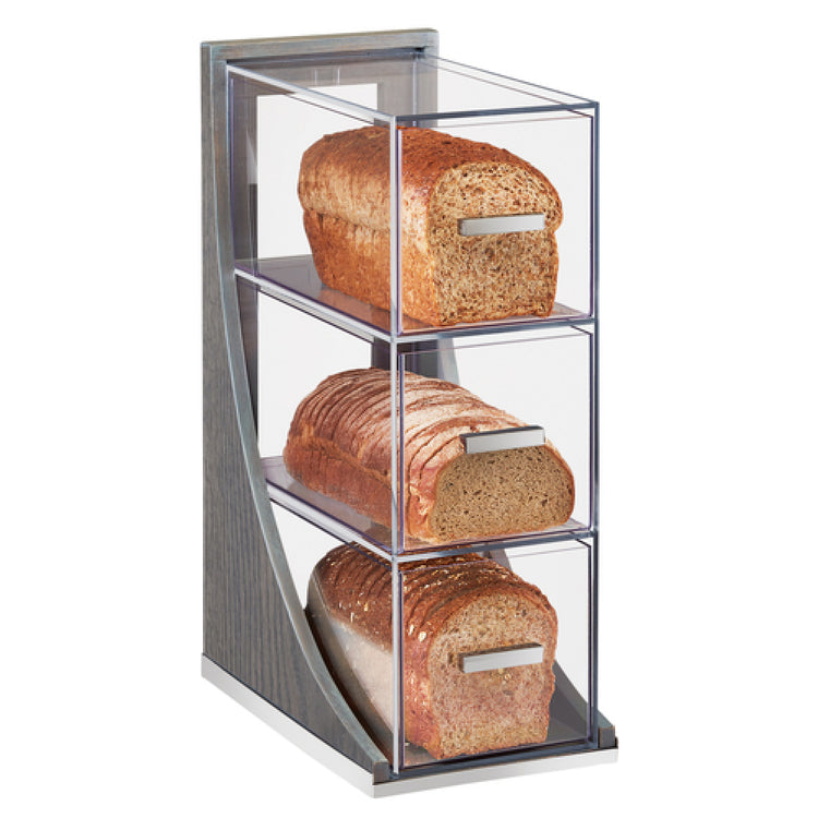 The Cal Mil 3815-83 Ashwood Bread Case is a sophisticated display solution designed for enhancing self-serve stations in any countertop setting. With dimensions of 6-1/2"W x 13"D x 20-1/4"H, this 3-tier bread case combines functionality with style, featuring three drawers that efficiently organize various bread types while allowing easy access. Its clear acrylic body not only ensures visibility of the contents but also adds a modern touch to its design. Complementing the acrylic is the sturdy oak wood framework finished in a gray wash, which adds a touch of elegance and durability, making it a versatile choice for upscale restaurants, cafes, and bakeries. The metal handles on each drawer enhance the aesthetic appeal while ensuring ease of operation. This non-refrigerated bread case is ideal for environments where maintaining room temperature is suitable. Its design facilitates a seamless integration into various culinary settings, appealing to establishments that prioritize both style and practicality in their service presentation. The Cal Mil 3815-83 Ashwood Bread Case stands out as an exceptional piece, crafted to elevate the presentation of bread and baked goods while maintaining a focus on quality and accessibility.