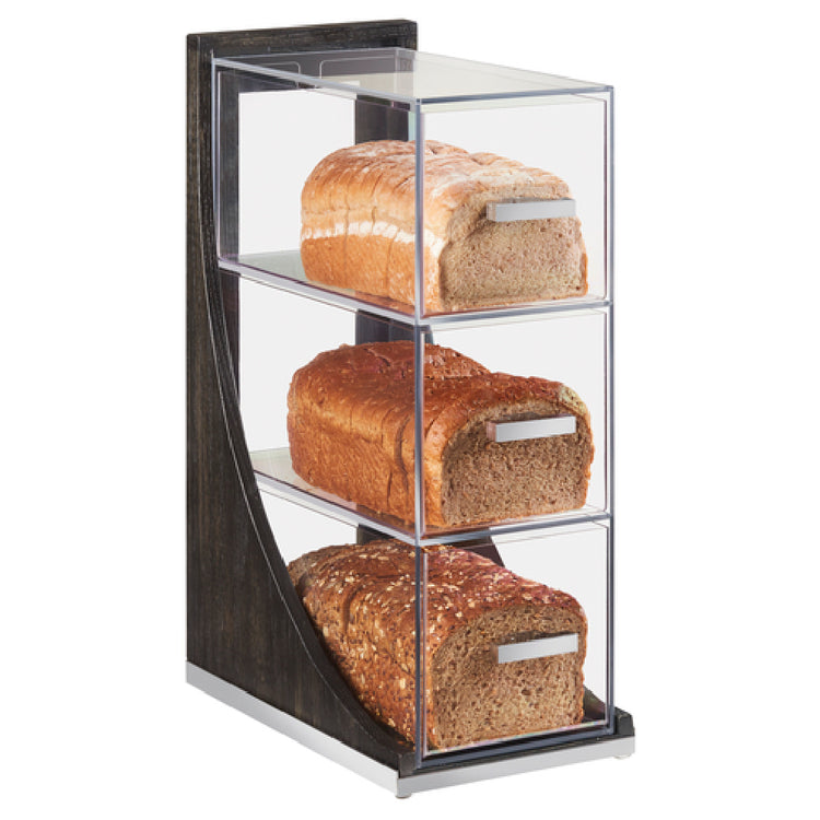 The Cal Mil 3815-87 Cinderwood Bread Case is a sophisticated storage solution, ideal for both commercial and residential settings where bread display and preservation are paramount. This vertical, 3-tier design maximizes space efficiency with dimensions of 6-1/2 inches in width, 13 inches in depth, and 20-1/4 inches in height. Each tier features pull-out drawers equipped with sturdy metal handles, facilitating easy access to your baked goods. The clear acrylic body of the bread case provides a clear view, enhancing product visibility while maintaining freshness and hygiene. Constructed with oak wood and finished in a dark ash gray, it adds a touch of elegance to any environment. The materials used are BPA-free, ensuring safe storage for food items. This bread case is ideally suited for bakeries, cafes, or any establishment that prioritizes both style and functionality in their food presentation. Its versatile design complements various decor styles, making it a valuable addition to your display repertoire.