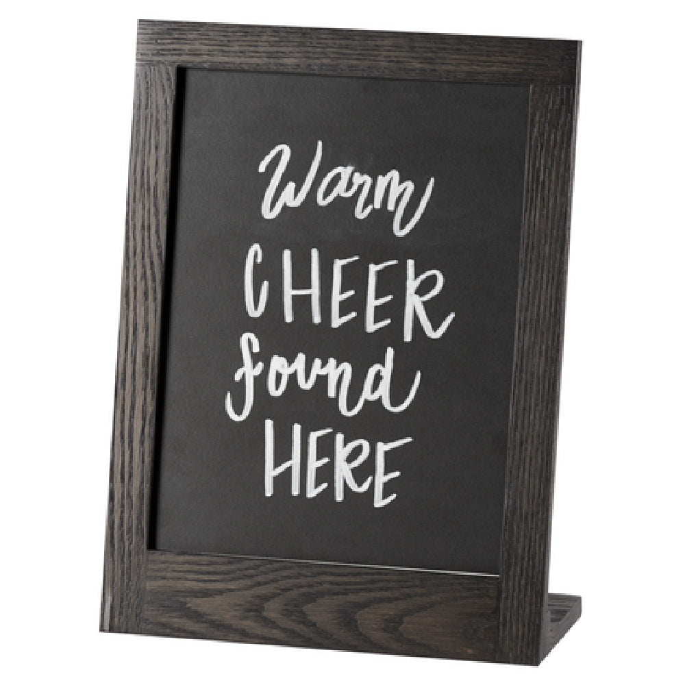 The Cal Mil 3818-811-87 Cinderwood Chalkboard Sign is a versatile and elegantly designed display solution, measuring 10-3/8"W x 4-3/4"D x 13-3/4"H in overall dimensions. It features a rectangular writing surface of 8-1/2" x 11", perfectly suited for a variety of messaging needs in diverse settings, from cafés and restaurants to retail spaces and corporate environments. The sign is framed in oak wood with a dark ash gray finish, adding a touch of sophistication to any setting. The BPA Free construction ensures a safe and eco-friendly product. Its combination of aesthetic appeal and functional design makes it an ideal choice for those looking to enhance their visual communication efforts. The Cal Mil 3818-811-87 sign effectively bridges traditional charm with modern utility, catering to a wide array of industry segments that require customizable display solutions. Whether used for daily specials, promotional messages, or directional signage, this chalkboard sign delivers both style and practicality, making it a valuable asset in any professional setting.