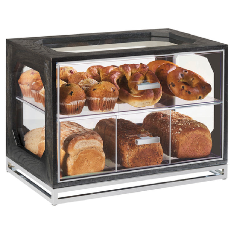 The Cal Mil 3820-87 Cinderwood Bread Display is a meticulously crafted rectangular unit measuring 20 inches in width, 13-1/2 inches in depth, and 15 inches in height. It is tailored for self-service applications and features four distinct compartments, making it perfectly suited for various bread display needs within the retail and food service industries. The display is designed with clear acrylic windows, providing excellent visibility of contents while ensuring product freshness and hygiene. Crafted from oak wood with a sophisticated dark ash gray finish, it adds a touch of elegance to any setting. As a BPA-free product, the Cal Mil 3820-87 caters to health-conscious consumers and businesses prioritizing safety and environmental responsibility. Its construction and design make it a valuable asset for bakeries, cafes, and restaurants that require an attractive and functional bread display solution. Emphasizing both aesthetics and practicality, this bread display is an ideal choice for establishments looking to enhance their presentation while maintaining high standards of food safety and quality.