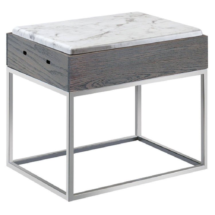 The Cal-Mil 3822-13-83 Ashwood Display Riser is a meticulously crafted rectangular piece measuring 15"W x 11"D x 13-1/4"H. This display riser is designed to seamlessly blend functionality with aesthetic appeal, making it a standout choice for various market segments, from upscale catering events to retail environments. The riser features a faux marble melamine top, providing a luxurious look without the associated weight and fragility of real marble. This top is not only visually striking but also easy to clean, ensuring durability in high-traffic areas. The inclusion of bracket slots enhances its versatility, allowing for customized presentation setups. The oak wood combined with a stainless steel base offers a sturdy and reliable structure, while the gray wash finish imbues a modern, sophisticated touch. This display riser caters to the needs of businesses looking to elevate their presentation with an attractive and practical solution. Its robust construction ensures it handles frequent use while maintaining its elegant appearance, making it an invaluable asset for showcasing products or culinary creations in any professional setting.