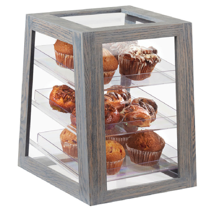 The Cal Mil 3830-83 Ashwood Mini Display Case is a meticulously crafted display solution measuring 11-1/4"W x 13-3/8"D x 14-7/8"H, offering a compact yet versatile design ideal for various market segments such as bakeries, cafes, and retail environments. This 3-tier vertical case features attendant serve functionality, providing an organized and visually appealing way to present your merchandise. Each tier comes with removable trays, enhancing ease of use and cleaning efficiency. The display's acrylic windows ensure clear visibility of contents while maintaining a sleek aesthetic. Constructed from oak wood with an ash gray finish, it presents a modern and elegant look, seamlessly integrating with diverse interior styles. Furthermore, the materials used are BPA Free, ensuring the case is a safe choice for food-related applications. The Cal Mil 3830-83 Ashwood Mini Display Case stands out as an excellent option for those seeking a balance of style, function, and safety in their display solutions.