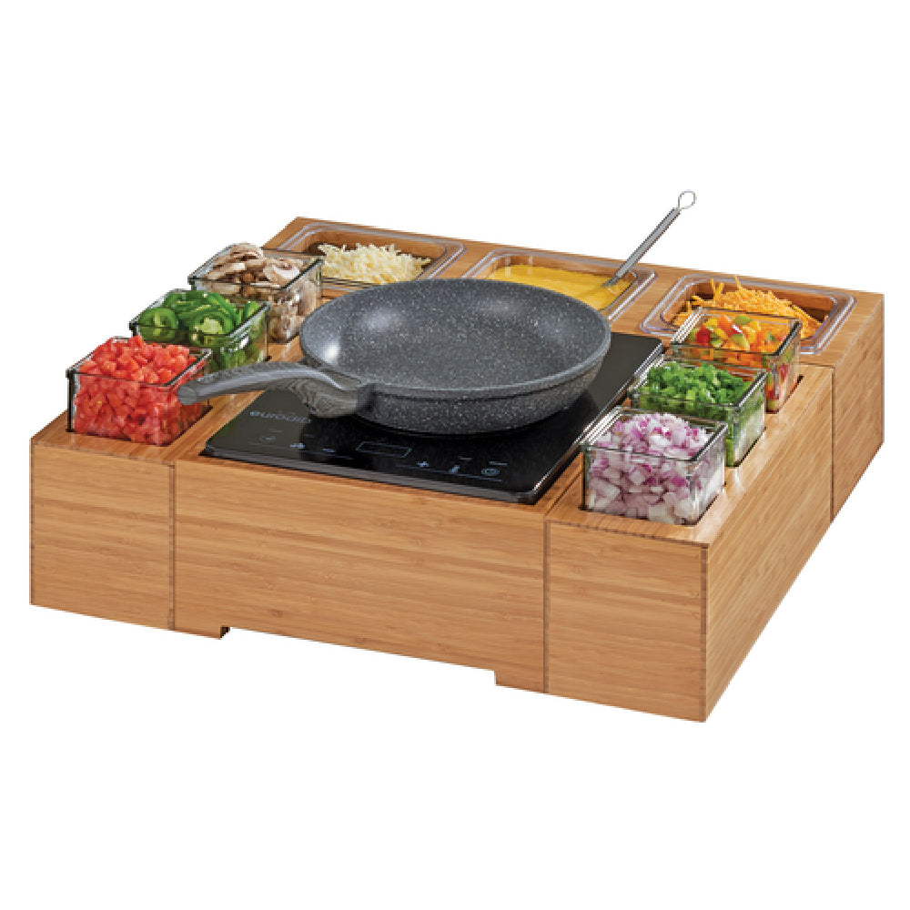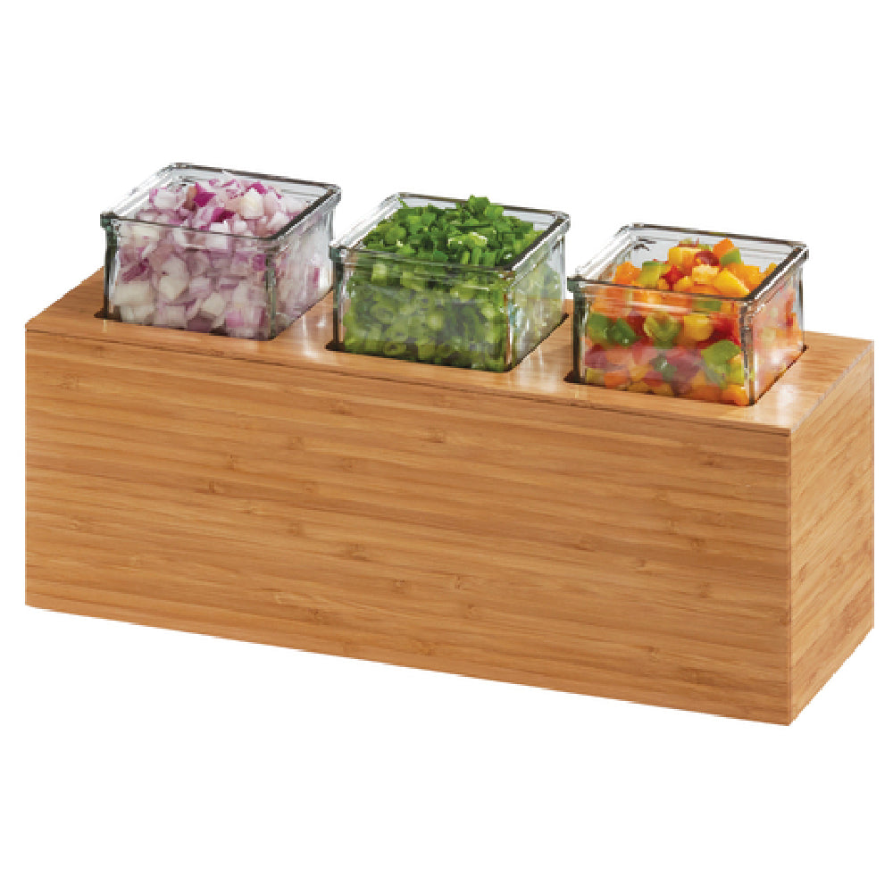 The Cal Mil 3836-3-60 Action Station Jar Unit is a versatile rectangular unit measuring 15-3/4 inches wide, 5-1/2 inches deep, and 8-3/4 inches high, designed to enhance efficiency in food service settings. This unit includes three glass jars that provide ample storage for various ingredients or condiments, allowing for easy access and presentation. It also comes with a cold puck to ensure that contents remain fresh and at an optimal temperature. The use of bamboo as a primary material not only lends an aesthetic appeal but also emphasizes sustainability, given its BPA-free nature. This careful selection of materials ensures safety and environmental responsibility, making it suitable for environmentally conscious users. The Cal Mil 3836-3-60 is ideal for diverse market segments, including restaurants, hotels, and catering services, due to its functional design and practical features. Its compact footprint and stylish presence make it a practical choice for any service area that values both efficiency and presentation. This unit’s thoughtful design encapsulates the needs of professionals in the food service industry where space efficiency, sustainability, and a refined appearance are paramount.