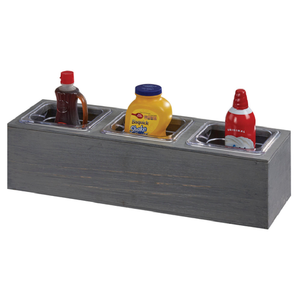 The Cal Mil 3837-3-83 Ashwood Action Station Pan Holder is a meticulously designed piece, measuring 11-3/4 inches in width, 7-1/2 inches in depth, and 6-1/4 inches in height, making it a compact yet functional addition to any culinary setting. Crafted from durable oak wood, this pan holder features an elegant ash gray finish that enhances its aesthetic appeal. It includes three 1/6 size pans and a cold puck, offering versatile storage solutions for various ingredients. This BPA-free product ensures safe food handling, making it an ideal choice for health-conscious establishments. The Cal Mil Ashwood Action Station Pan Holder stands out in the hospitality industry by providing a practical and stylish solution for organizing and displaying ingredients in a streamlined manner. Its unique design caters to the needs of professional chefs, catering services, and event planners who require efficient and aesthetically pleasing setups. This pan holder's compact size allows for easy integration into existing kitchen layouts, while its oak wood construction guarantees longevity and durability, making it a reliable investment for any food service operation. Its blend of functionality and style positions it as a valuable asset in the dynamic environments of restaurants, hotels, and catering services.