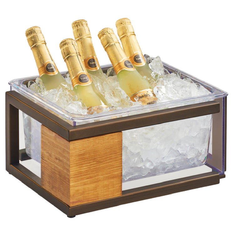 The Cal Mil 3905-10-84 Sierra Ice Housing is a meticulously designed product featuring dimensions of 13-1/4"W x 11-1/4"D x 6"H, making it a compact yet functional solution for various display needs. This product is distinguished by its clear polycarbonate pan insert, which provides an unobstructed view of the contents while ensuring durability and longevity. The rustic pine and metal frame further enhance its aesthetic appeal, offering a blend of natural and industrial design elements that make it suitable for a wide range of settings. Finished with a bronze coating, the frame not only adds a touch of elegance but also contributes to the structural integrity of the unit. This ice housing unit is an ideal choice for professionals in the food service industry, including caterers, event planners, and restaurant owners, who require a reliable and visually appealing display solution. Its clear construction and robust materials ensure that it not only meets functional demands but also complements any decor style, making it a versatile addition to any professional setup.