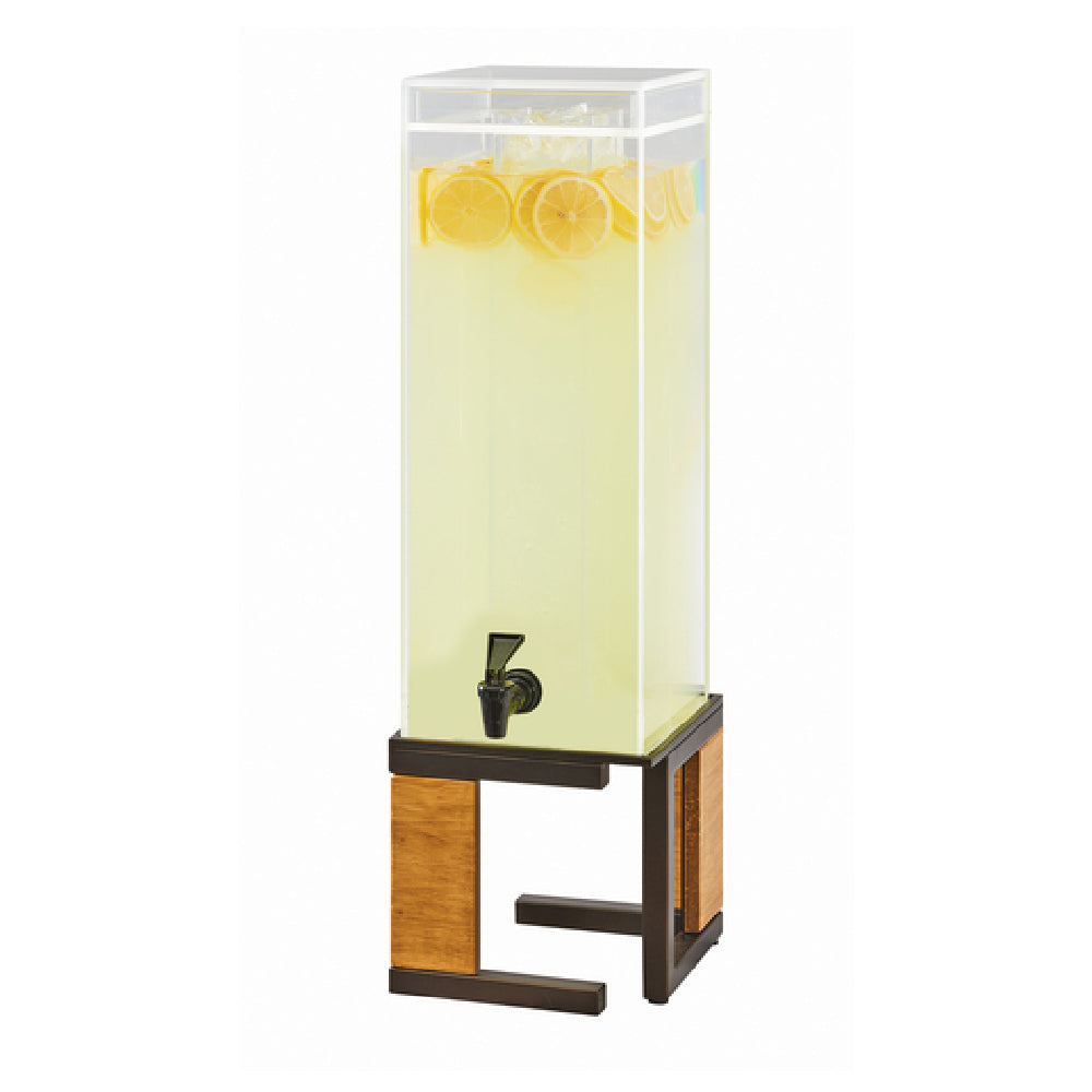 The Cal Mil 3906-3-84 Sierra Beverage Dispenser is a premium hydration solution featuring a generous 3-gallon capacity, making it suitable for a wide range of settings, from upscale catering events to bustling cafes. With dimensions of 8-3/4"W x 8-3/4"D x 24"H, this square dispenser is designed to fit seamlessly into compact spaces while offering substantial beverage storage. A distinctive feature of this dispenser is its integrated ice chamber, which ensures that drinks remain chilled without diluting flavors, making it ideal for serving a variety of refreshments from lemonades to iced teas. Complemented by a practical drip tray, it assists in maintaining cleanliness and reducing waste during service. The dispenser exudes a rustic charm with its pine accents, further enhanced by a sturdy metal frame and a sophisticated bronze finish. This combination not only ensures durability but also adds a touch of elegance, making it a striking centerpiece for any beverage station. The Cal Mil 3906-3-84 Sierra Beverage Dispenser is particularly valuable for the hospitality industry, providing an aesthetically pleasing yet functional solution for high-volume drink service, thereby meeting the needs of both event coordinators and café owners alike.
