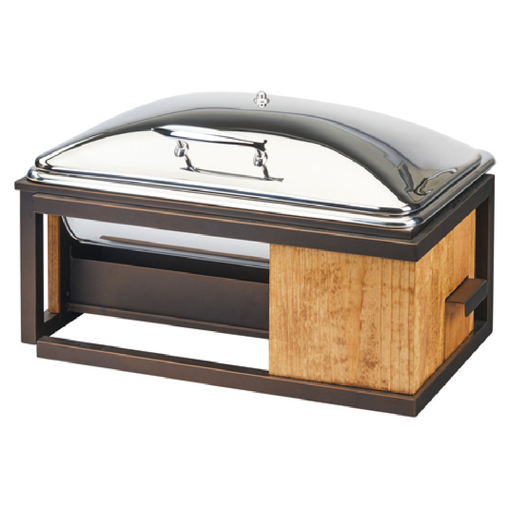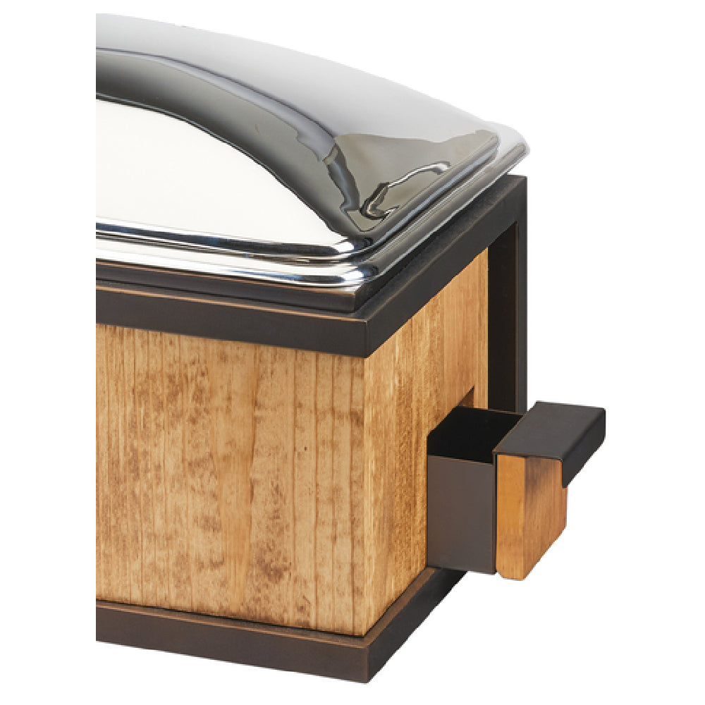 The Cal Mil 3907-84 Sierra Chafer is a versatile and efficient solution for catering and buffet settings, featuring an 8 qt. capacity that makes it perfect for serving a variety of dishes. Measuring 22"W x 15"D x 14"H, this rectangular chafer fits seamlessly into any service setup. It is equipped with a hinged stainless steel lift-off lid, complete with a handle for ease of use, allowing for quick access to the food while maintaining temperature. The inclusion of a chafer drawer enhances its functionality by enabling the easy placement of fuel, ensuring your dishes remain warm. The windguard feature provides additional protection from breezes, making it suitable for both indoor and outdoor events. Crafted with a rustic pine metal frame and finished in bronze, the Sierra Chafer not only delivers on durability but also adds an aesthetic appeal to any presentation. This chafer is designed to meet the demands of high-volume dining environments, making it a reliable choice for professional caterers, hospitality venues, and event organizers looking for robust and stylish serving equipment.