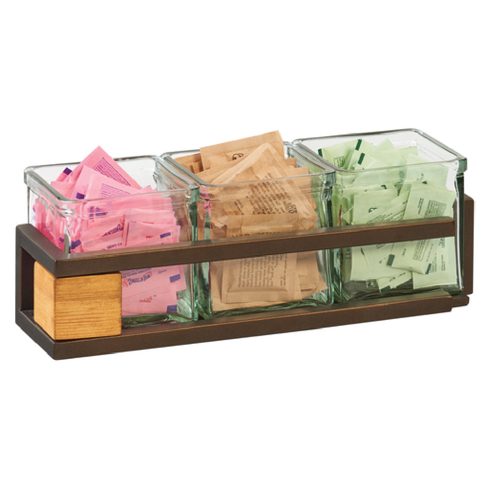 The Cal Mil 3910-3-84 Sierra Jar Display is a meticulously crafted unit designed for a variety of display needs, featuring precise dimensions of 13"W x 5"D x 4-1/4"H. This elegant piece includes three glass jars, each measuring 4"W x 4"D, providing a refined solution for showcasing an array of items. The display is constructed with a rustic pine base, adding a natural, warm aesthetic that complements various settings. Enhanced by a sturdy metal frame with a sophisticated bronze finish, this display seamlessly combines durability with a touch of elegance. Ideal for retail environments, hospitality settings, or home decor, the Sierra Jar Display caters to diverse market segments by offering a versatile presentation platform. Its compact and rectangular design ensures it fits comfortably on countertops or display tables, making it a practical choice for maximizing space while enhancing visual appeal. The combination of natural materials and a sleek metallic finish highlights its unique value proposition, appealing to those who prioritize both style and functionality in their display solutions. Whether used to present confectionery, condiments, or decorative items, the Cal Mil 3910-3-84 Sierra Jar Display delivers a sophisticated yet functional addition to any setting.