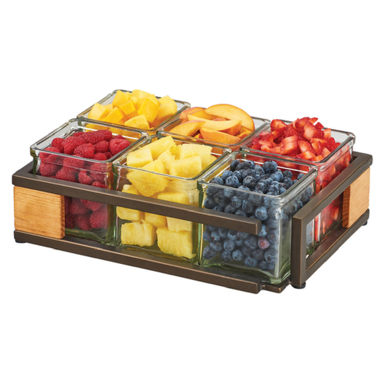 The Cal Mil 3910-6-84 Sierra Jar Display is an elegantly crafted storage solution, perfect for a variety of display needs across different market segments including hospitality, retail, and culinary industries. This functional piece measures 12-1/2"W x 9"D x 4-1/2"H, providing ample space to showcase contents while maintaining a sophisticated aesthetic. It includes six 4"W x 4"D glass jars, ideal for organizing and displaying a range of items from condiments to small retail goods. The rectangular design is complemented by a rustic pine base, exuding a natural charm that enhances any display setting. The sturdy metal frame with a bronze finish not only adds to the visual appeal but also ensures durability and stability, making it a reliable option for high-traffic environments. The Cal Mil 3910-6-84 Sierra Jar Display is an excellent choice for businesses seeking a versatile and stylish display solution, marrying both form and function to create a visually engaging presentation. Whether used in a restaurant buffet, a hotel breakfast bar, or a retail counter, this display set promises to elevate the presentation of products in any professional setting.