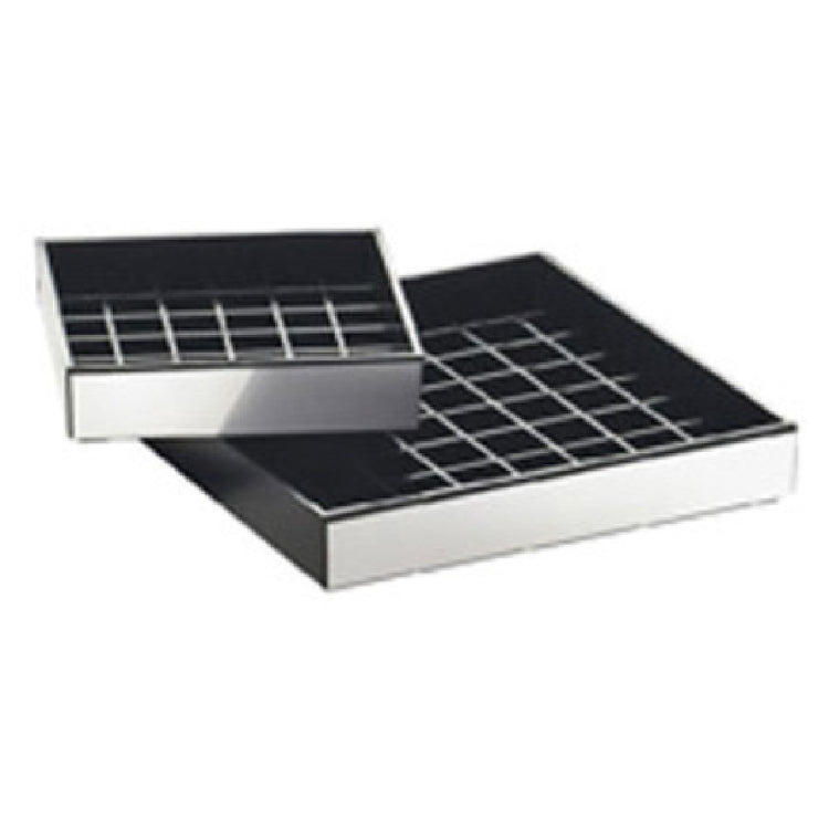 The Cal Mil 392-010 Drip Tray 4" X 4" Square is a compact and functional accessory designed to meet the needs of various industries, from food service to hospitality. Measuring 4 inches by 4 inches, this drip tray efficiently catches spills and drips, helping to maintain a clean and organized workspace. Its square design maximizes surface area for collection, while the sleek black finish with silver trim adds a touch of modern elegance, making it suitable for both front-of-house and back-of-house applications. The tray's durable construction ensures long-lasting performance, and its neutral color scheme allows it to seamlessly blend into any setting, whether it be on countertops, coffee stations, or bar areas. The Cal Mil 392-010 is an excellent solution for businesses looking to enhance cleanliness and efficiency, reflecting a commitment to quality and functionality in their operations. This drip tray is particularly relevant for environments that prioritize aesthetic appeal alongside practicality, making it a versatile tool across different sectors.