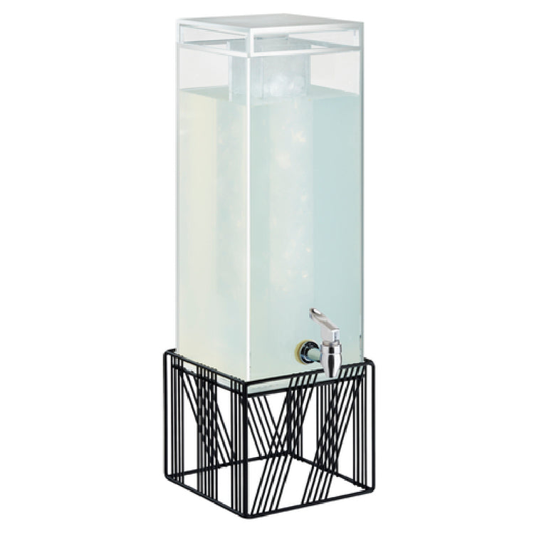 The Cal Mil 4102-3-13 Portland Beverage Dispenser is a high-capacity unit designed to meet the diverse needs of the food and beverage industry with its 3-gallon capacity, which makes it suitable for catering events, hotels, and large-scale dining environments. Its dimensions of 7-7/8"W x 7-7/8"D x 24-7/8"H ensure a compact yet substantial presence on any countertop. The dispenser is square in shape, which maximizes space efficiency and offers a modern aesthetic appeal. This product includes an ice chamber, enhancing its functionality by keeping beverages cool without diluting them. A drip tray is incorporated to maintain cleanliness and minimize spillage during use. The unit features an easy-to-use spigot for efficient beverage dispensing. Constructed from durable acrylic, it boasts an acrylic body that combines clarity with strength, making it both lightweight and resilient. The wire base, finished in black, adds stability and an elegant touch to the design. Importantly, the dispenser is BPA Free, ensuring it meets safety standards for food and beverage containers. The Cal Mil 4102-3-13 is an ideal choice for establishments that require a robust, efficient, and aesthetically pleasing beverage dispensing solution.