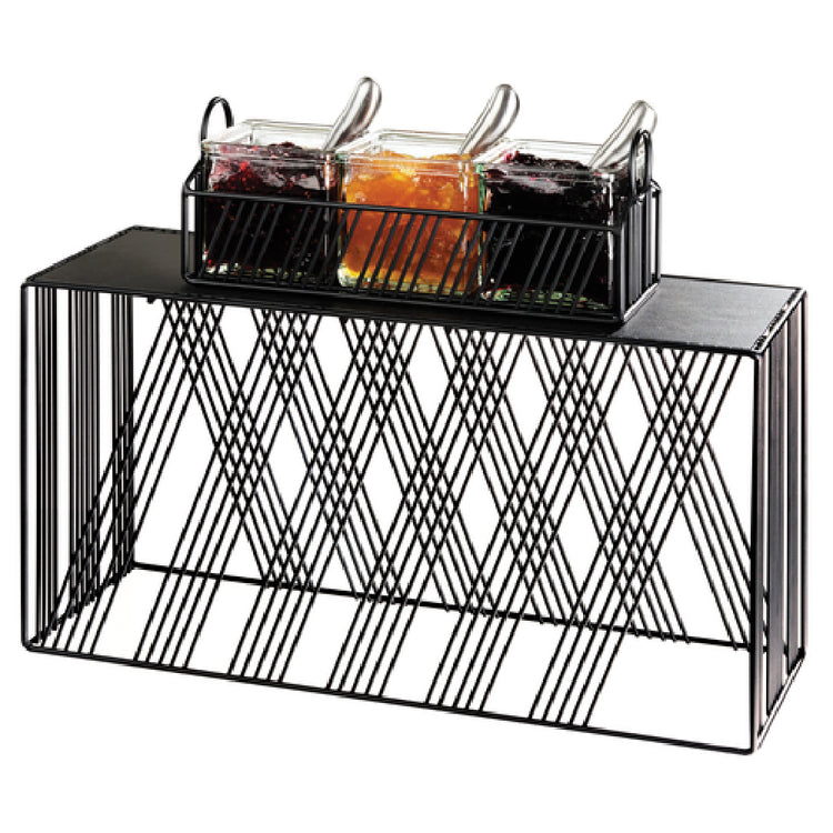 The Cal Mil 4103-11-13 Portland Riser is a versatile and stylish addition to any display setting, meticulously engineered to meet diverse industry needs. With dimensions of 20-1/8"W x 7"D x 11"H, this rectangular riser provides ample space for showcasing a variety of items, making it ideal for food service businesses that require dynamic presentation solutions. The inclusion of a removable bread board enhances its functionality, allowing for easy customization of display configurations. Constructed from durable iron wire, the riser features a sleek black finish that adds a modern touch to its design. Its BPA-free construction signifies a commitment to safety and health, catering to establishments that prioritize non-toxic materials in their food display products. The Cal Mil 4103-11-13 Portland Riser stands out for its ability to seamlessly integrate into both contemporary and traditional settings, making it an invaluable asset for restaurants, catering events, and retail spaces looking to elevate their display aesthetics while maintaining a focus on practicality and hygiene. This product effectively combines aesthetic appeal with functional design, offering a unique value proposition to various market segments within the food and beverage industry. Its thoughtful craftsmanship and user-focused features underscore its role as an essential component in professional presentation environments.