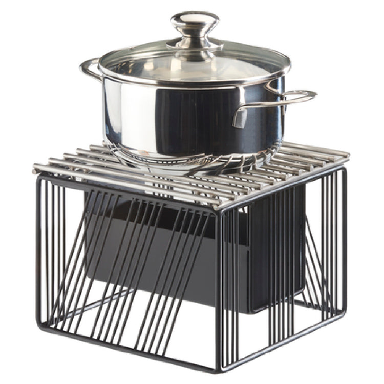 The Cal Mil 4106-13 Portland Chafer Alternative 10-1/4"W x 10"D x 7-1/2"H Small is an innovative and versatile solution for catering and hospitality industries seeking a compact and efficient warming solution. Measuring 10-1/4 inches in width, 10 inches in depth, and 7-1/2 inches in height, this small rectangular chafer is designed to fit seamlessly into various service setups. Its grill top feature enhances functionality, offering a practical surface for maintaining food temperature. Built with a windguard, it provides effective protection against external elements, ensuring optimal performance in both indoor and outdoor settings. The induction-ready design allows for modern, energy-efficient heating options, catering to the demands of contemporary food service operations. Constructed from durable wire and finished in a sleek black, it adds a touch of elegance to any presentation while ensuring longevity and resilience. The BPA-free composition underscores its commitment to safety and quality, making it a reliable choice for health-conscious establishments. Tailored for diverse market segments within the industry, the Cal Mil 4106-13 Portland Chafer Alternative offers a unique value proposition with its blend of modern design, practical features, and safety compliance, ideal for upscale buffets, catered events, and outdoor dining experiences.