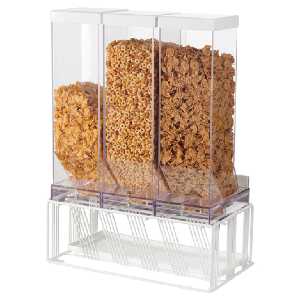 The Cal Mil 4108-15 Monterey Cereal Dispenser is designed to enhance the cereal-serving experience with its three 9.8-liter capacity bins, offering a combined substantial volume that caters to high-demand environments. This dispenser measures 17-1/4 inches in width, 10-1/2 inches in depth, and 23-1/2 inches in height, making it a compact yet impactful addition to any countertop. Engineered with a pull & serve mechanism, it ensures smooth and efficient cereal dispensing, minimizing mess and maximizing convenience. The included crumb catcher further maintains cleanliness by collecting excess cereal particles. Constructed from durable plastic with a robust steel base, this dispenser is both sturdy and reliable. The elegant white finish complements various decor styles, while its BPA-free materials ensure safety and peace of mind. This product is ideal for a variety of market segments, including hotels, cafeterias, and self-serve breakfast areas, where its user-friendly design enhances guest satisfaction. Its technical specifications and thoughtful design make it a versatile solution in food service operations looking to streamline their breakfast offerings with a reliable and attractive cereal dispensing unit.