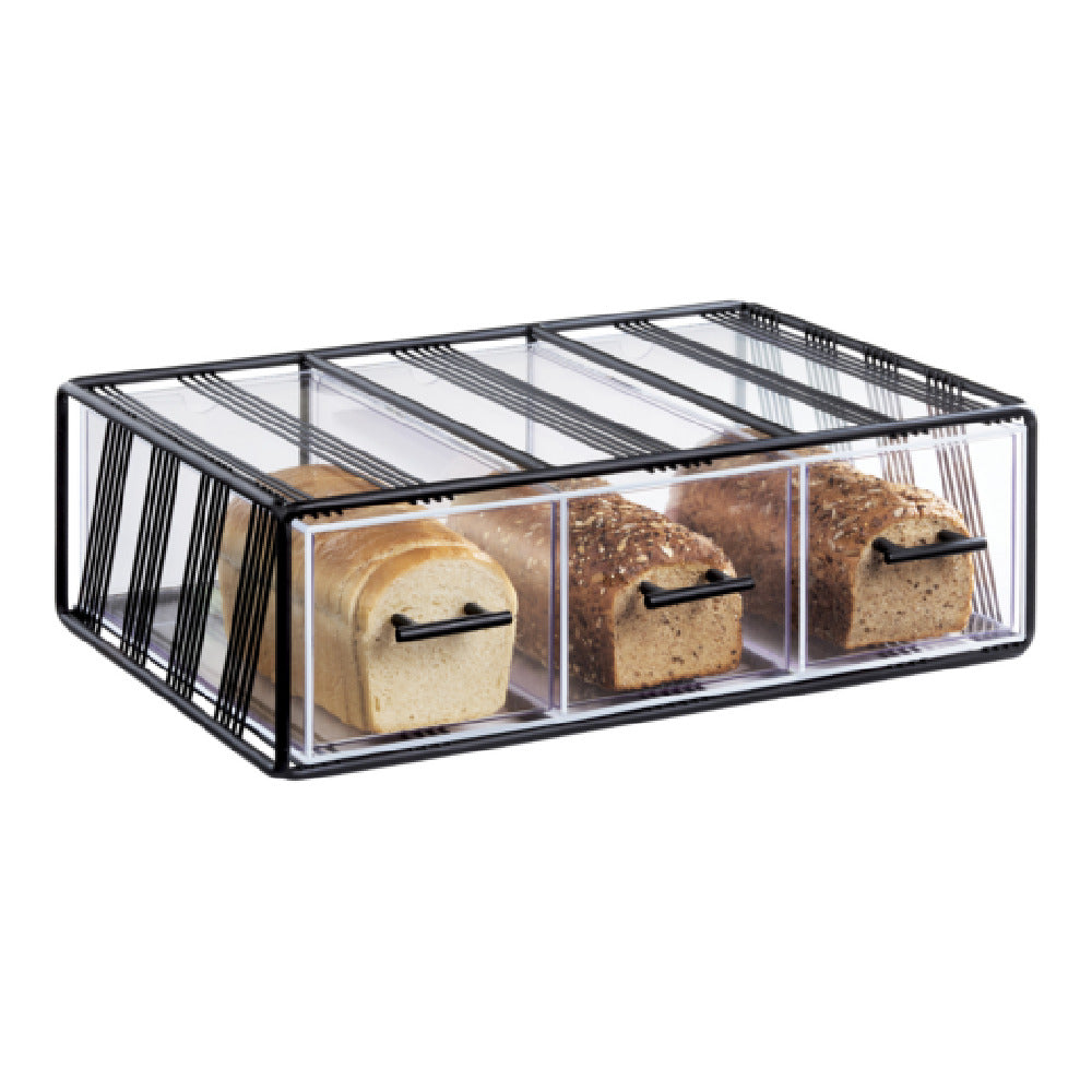 The Cal Mil 4119-13 Portland Bread Display is a versatile and stylish solution for showcasing baked goods in a variety of settings. With dimensions of 22-1/4"W x 14-3/4"D x 7"H, this rectangular display is compact yet spacious, making it suitable for different market segments such as bakeries, cafes, and restaurants looking to present their bread selections elegantly. This display unit features three drawers, each equipped with sleek black handles, allowing for easy access and organization. The combination of steel and acrylic materials ensures a durable and visually appealing construction, while the BPA-free composition underscores its commitment to safety and health standards. The Cal Mil 4119-13 not only provides an efficient storage solution but also enhances the aesthetic appeal of any countertop or display area, making it an excellent choice for establishments aiming to impress their customers while maintaining the quality and freshness of their bread products. This blend of functionality and design makes it a valuable addition to food service environments where both presentation and practicality are prioritized.