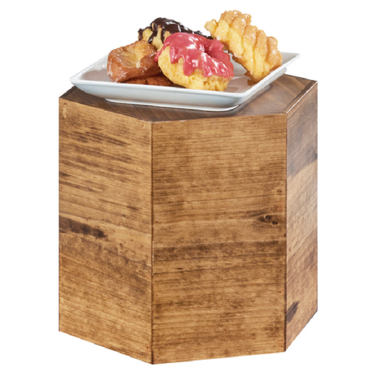 The Cal-Mil 435-11-99 Madera Riser 12" Dia. X 11"H Hexagon is a versatile display solution crafted for both aesthetic appeal and functional utility. Featuring a 12-inch diameter and an 11-inch height, this uniquely shaped hexagon riser stands out in any display arrangement. Constructed from rustic pine, it provides a natural and warm appearance ideal for businesses seeking to enhance their presentation style with an earthy touch. The riser is BPA Free, ensuring no harmful chemicals compromise the safety of the products displayed. This makes it an excellent choice for venues prioritizing health and safety standards, such as restaurants, cafes, and food service operations. Its rustic pine construction not only complements wooden furnishings but also adds depth and character to various table settings, making it suitable for both traditional and contemporary environments. The Cal-Mil 435-11-99 Madera Riser is particularly beneficial for showcasing products at different heights, thereby enhancing visual interest and accessibility in culinary presentations or retail displays. Whether used for buffet arrangements, catering events, or retail merchandising, this riser delivers a combination of durability and style, catering to diverse industry needs while maintaining a commitment to sustainability and safety.