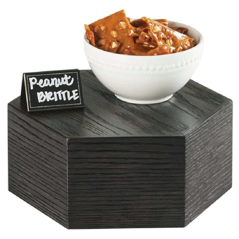 The Cal-Mil 435-5-87 Cinderwood Riser 12" Dia. X 5"H Hexagon is a versatile display accessory designed to enhance presentation settings across various industries. This riser, featuring a 12-inch diameter and a height of 5 inches, is crafted in a distinctive hexagon shape, providing a unique geometric appeal. Constructed from high-quality oak wood, it offers both durability and an elegant aesthetic. The dark painted finish adds a touch of sophistication, making it suitable for upscale environments such as restaurants, hotels, and catering events. Importantly, the Cal-Mil Cinderwood Riser is BPA Free, ensuring it meets safety standards for food-related applications. This feature is particularly advantageous for businesses seeking to maintain health-conscious and eco-friendly practices. The riser's dimensions and design make it ideal for a variety of uses, from elevating culinary creations to enhancing product displays in retail settings. Its sturdy construction ensures it can support a variety of items, while the stylish finish complements modern decor themes. The Cal-Mil 435-5-87 Cinderwood Riser thus stands out as a multifunctional and aesthetically pleasing solution for professionals aiming to elevate their presentation with a touch of elegance and safety assurance.