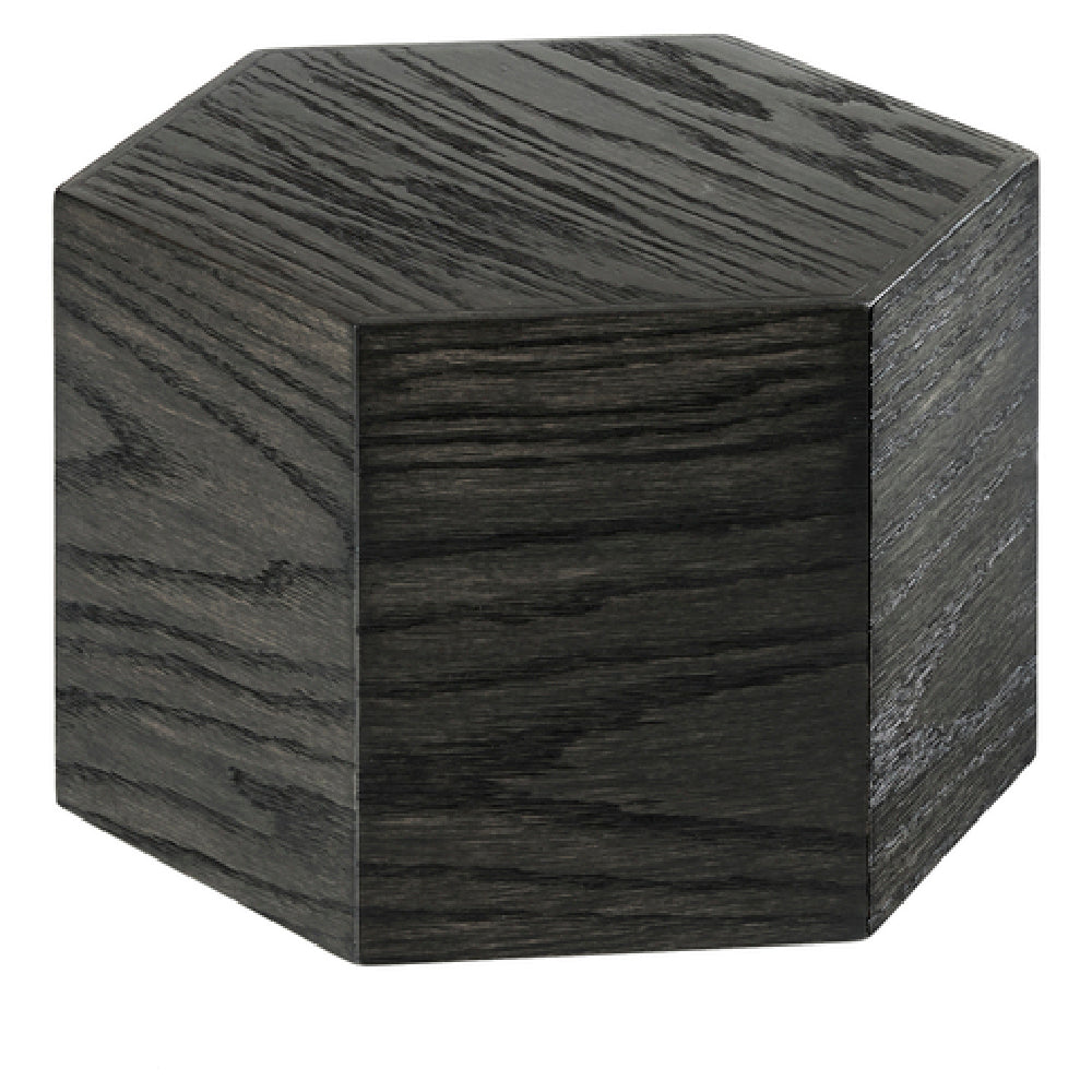 The Cal Mil 435-8-87 Cinderwood Riser 12" Dia. X 8"H Hexagon is crafted with meticulous attention to detail, embodying a blend of functionality and aesthetic appeal. This riser is constructed from oak wood, a material celebrated for its durability and timeless elegance, and is finished with a dark paint that accentuates the natural grain of the wood. The product's hexagonal shape, measuring 12 inches in diameter and standing 8 inches high, provides a unique geometric appeal that distinguishes it within any display setup. Notably, the riser is BPA-free, reflecting a commitment to safety and environmental consciousness. The Cal Mil Cinderwood Riser is particularly suited for diverse segment markets such as hospitality, catering, and retail, where it can be used to elevate food presentations or merchandise displays. Its robust construction ensures it can withstand frequent use, making it a reliable choice for professionals seeking both style and substance in their display solutions.