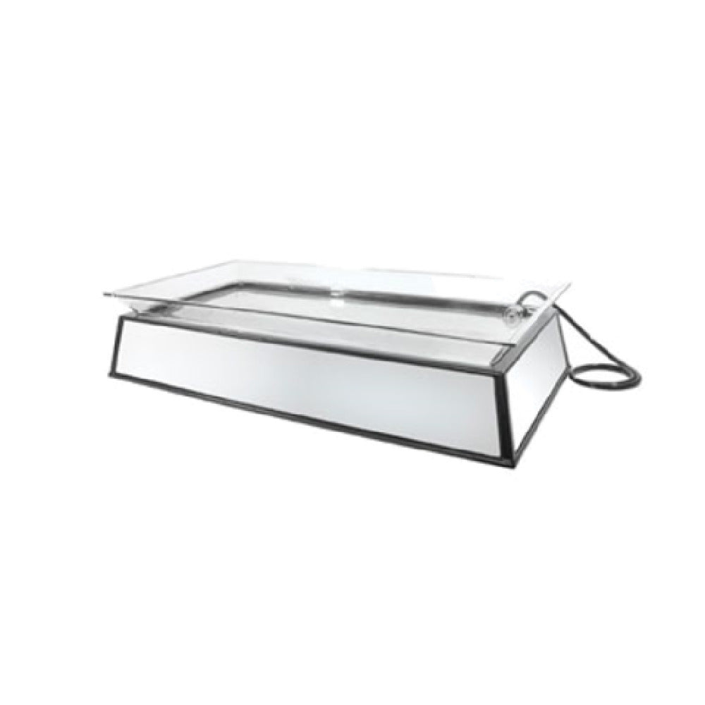 The Cal Mil IP201-110 Ice Display/Pedestal is a versatile rectangular unit designed to enhance any presentation with its impressive features. Measuring 24 inches wide, 48 inches deep, and 14 inches high, it boasts a durable, chip-resistant clear PETG ice pan for reliable use in various environments. The ice display is framed with acrylic mirror laminate panels, providing an elegant finish while being resistant to stains and scratches, ensuring longevity and easy maintenance. Built-in LED lights, with over 20 light patterns, illuminate the display, adding a dynamic visual appeal, while the integrated drainage system prevents water accumulation. Capable of supporting up to 500 pounds, this ice display/pedestal is crafted from sturdy ABS-plastic, offering both durability and stability. The unit operates at 110 volts, making it suitable for a wide range of settings, from upscale catering events to bustling buffets in hotels and restaurants. The Cal Mil IP201-110 is not only functional but also adds a sophisticated touch to any presentation, making it an ideal choice for those seeking a reliable and stylish ice display solution in the food service industry.