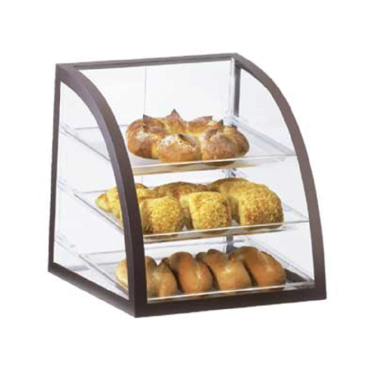 The Cal Mil P255-48 Display Case is a versatile 3-tiered countertop unit, measuring 15-1/2"W x 17"D x 16-3/4"H, ideal for various foodservice settings seeking efficient product showcasing. This non-refrigerated display case features an attendant serve design, tailored to facilitate seamless customer interaction. Its Euro sloped front enhances product visibility and accessibility, while the rear door ensures convenient loading and unloading operations. Constructed from a clear acrylic body and supported by an iron brown frame, the case combines durability with a sophisticated aesthetic. The see-thru design further maximizes visibility, allowing for an appealing presentation of contents. Equipped with three 10" x 14" clear trays (335-10-12), this display case offers ample space for presenting an array of delicacies. The BPA-free construction underscores its commitment to safety and hygiene standards, making it suitable for environments prioritizing health compliance. The Cal Mil P255-48 Display Case is a practical solution for bakeries, cafes, and other retail establishments that require a reliable, stylish, and health-conscious method to display their products while maintaining a sleek countertop presence.